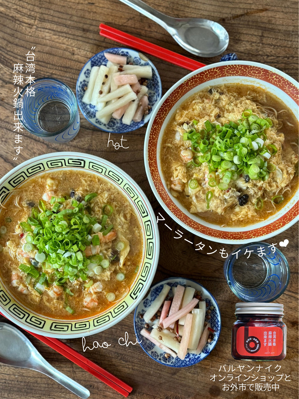 海老と卵を使った海老玉麻辣湯 材料𓐐1人分 〝台湾本格麻辣火鍋出来ます〟 大さじ2 醤油 大さじ1 お湯 300ml お好きな麺(今回は蝦子麵使用) 1人前(1玉) お素麺などの細麺がオススメ 海老(1尾を4つぐらいに切る) 5尾 卵 1コ 青葱