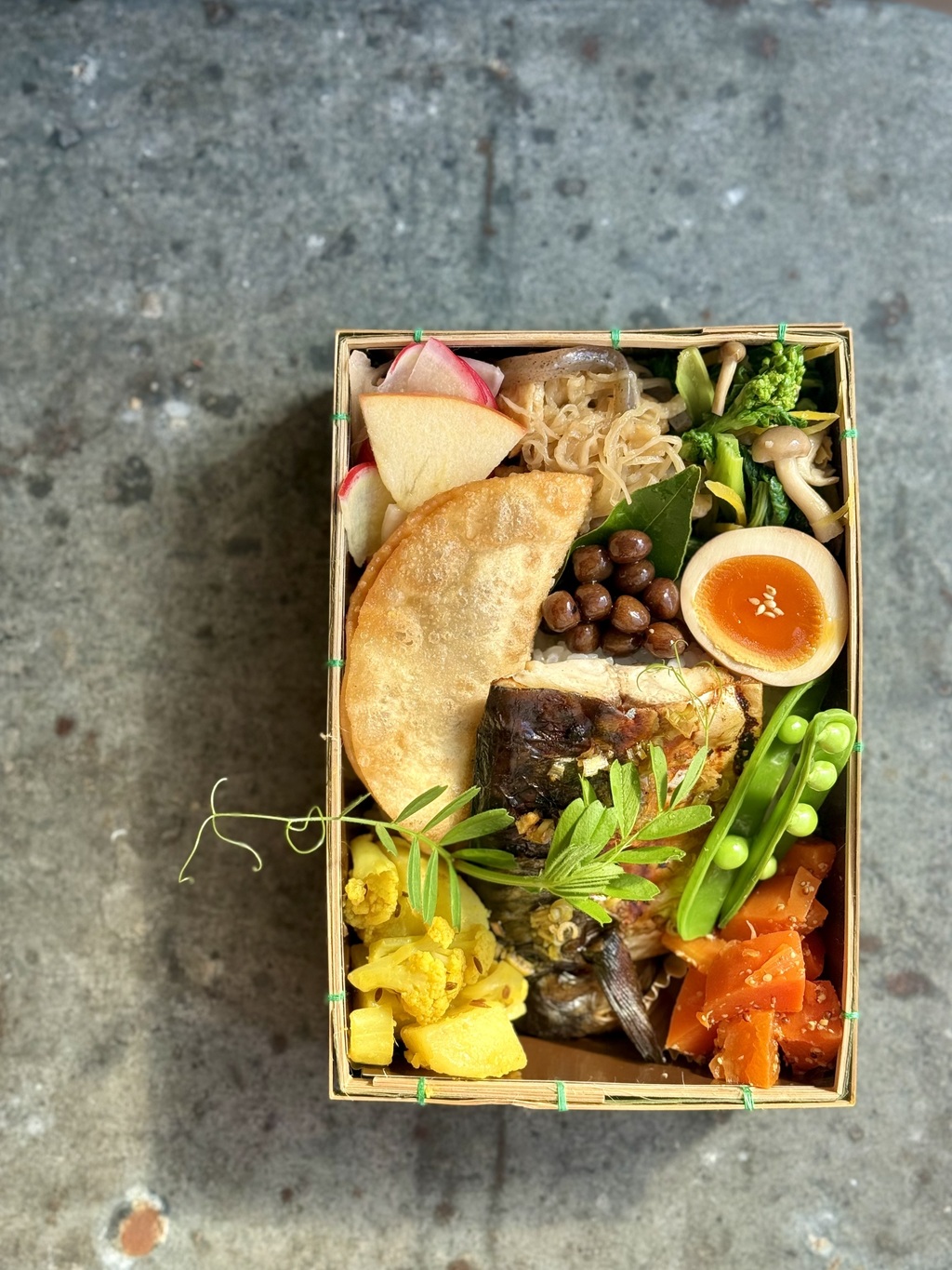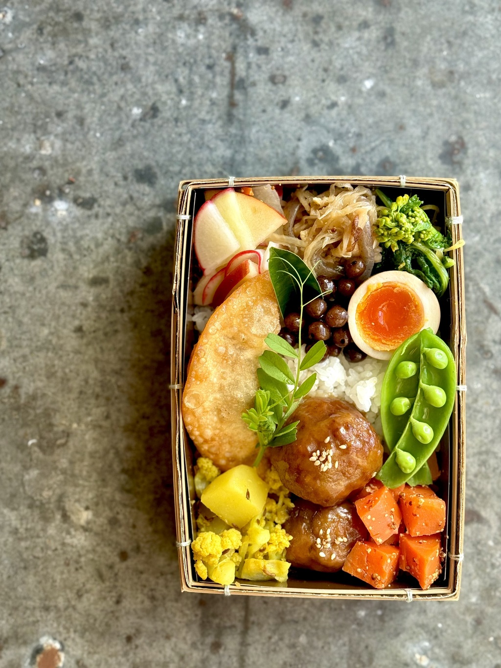 【お肉弁】台湾肉丸 【お魚弁】鯖のタイ風レモングラスグリル 人参のハニーマスタード アルゴビ(カリフラワーとじゃがいものスパイス炒め 菜花のベトナム風和え物 レディサラダ(赤大根)とりんごのマリネ 茶葉蛋風味玉 赤えんどう豆甘煮 台湾胡椒餅風揚げ餃子 スナップエンドウ ごはん
