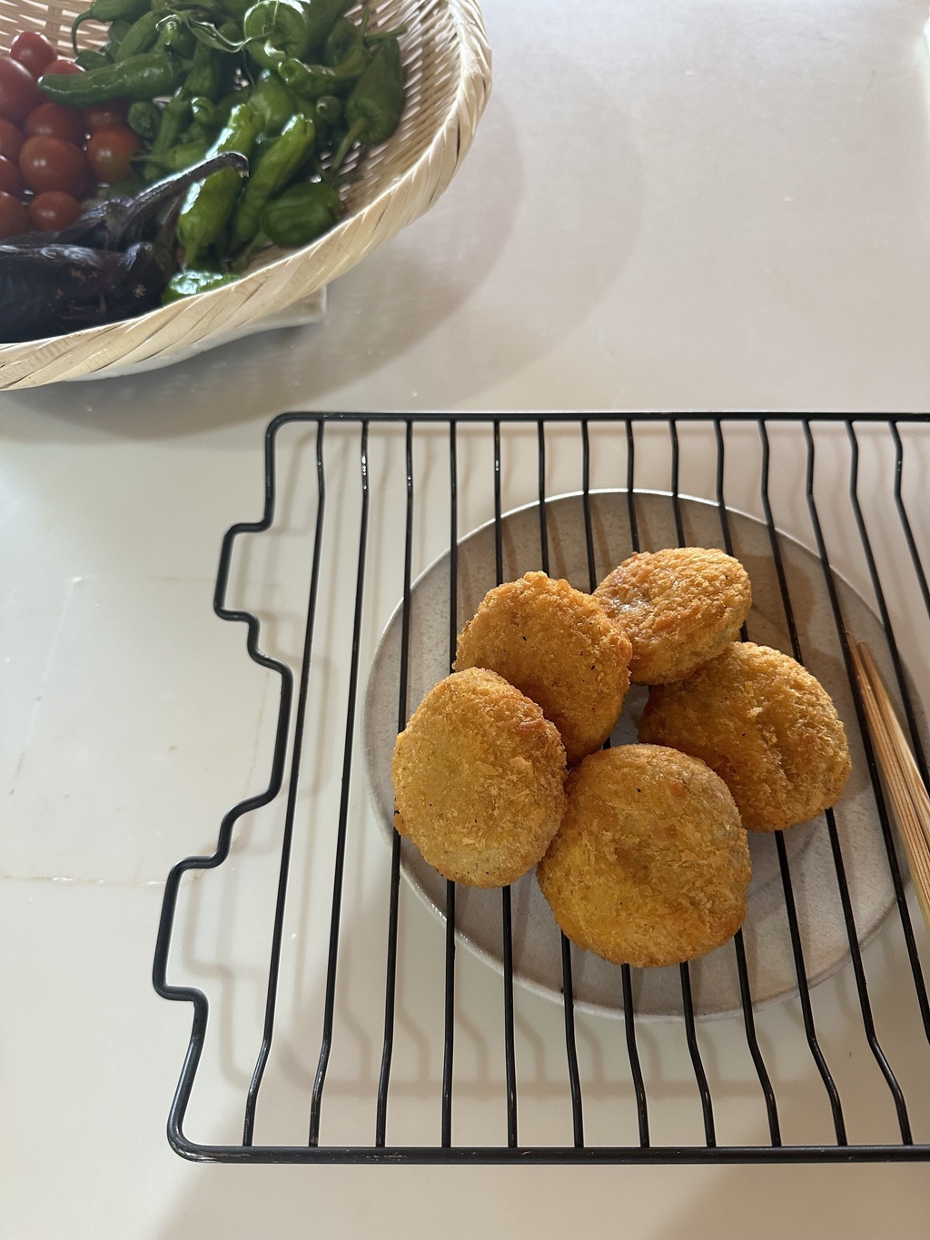 子供達の楽しみといえば、食べることくらいの夏休み。 畑から帰って来た私を待ち受けるのは、 「今日の夕ご飯、何?」 はいー。。。名もなき料理の日もあるわけですが、「なんか、焼いたん。」とか言ものなら、がっくし肩をわかりやすく落とされるわけで、、。笑。そーだよな! で、リクエストを聞いちゃったりするわけだ。 そうすると、返って来た答えが、 「コロッケ!」(もちろん一から作るやつ。。。) 「。。。。(聞いた私がバカだった)」 でも、美味しいんよね、手作りのコロッケ。私も、食べたいけれども! 体力が、残されていない、、、。 「ちょっと、今日はなー。。」という返答になるわけで。「はいはい。」そうでしょうとも。的な、反応。