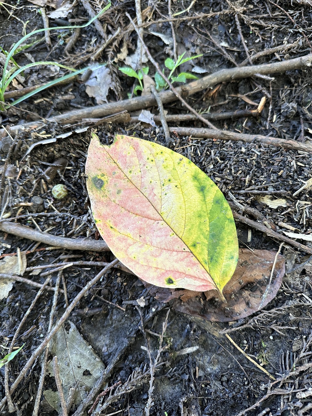 その一枚の中に花畑が広がっているような、とりどりの色を乗せた葉っぱが落ちていました。 土の上に一枚ひらりと落ちていて、鮮やかで思わず見惚れてしまうような色合いでした。 紅葉、でもなく、フシギな色に染まった柿の葉っぱ。 可愛くて、おとぎ話みたいでした。