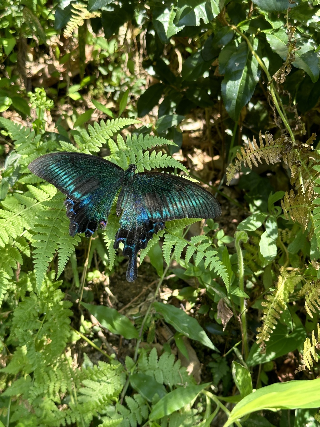 別の日、 くたくたになって、そろそろ家に帰ろうと畑の仕舞いをしていたら、 ヒラヒラと舞う、黒い翳。 大きくて、黒くて、目をひく蝶々でした。 パタパタと羽ばたくのをみていたら、黒一色ではなくって、不思議な色合い! ヘトヘトなのに、携帯持って追いかけていました。 虫取り網じゃなくて。時代だな。 いや、歳だな、、、。追いつけない(泣)
