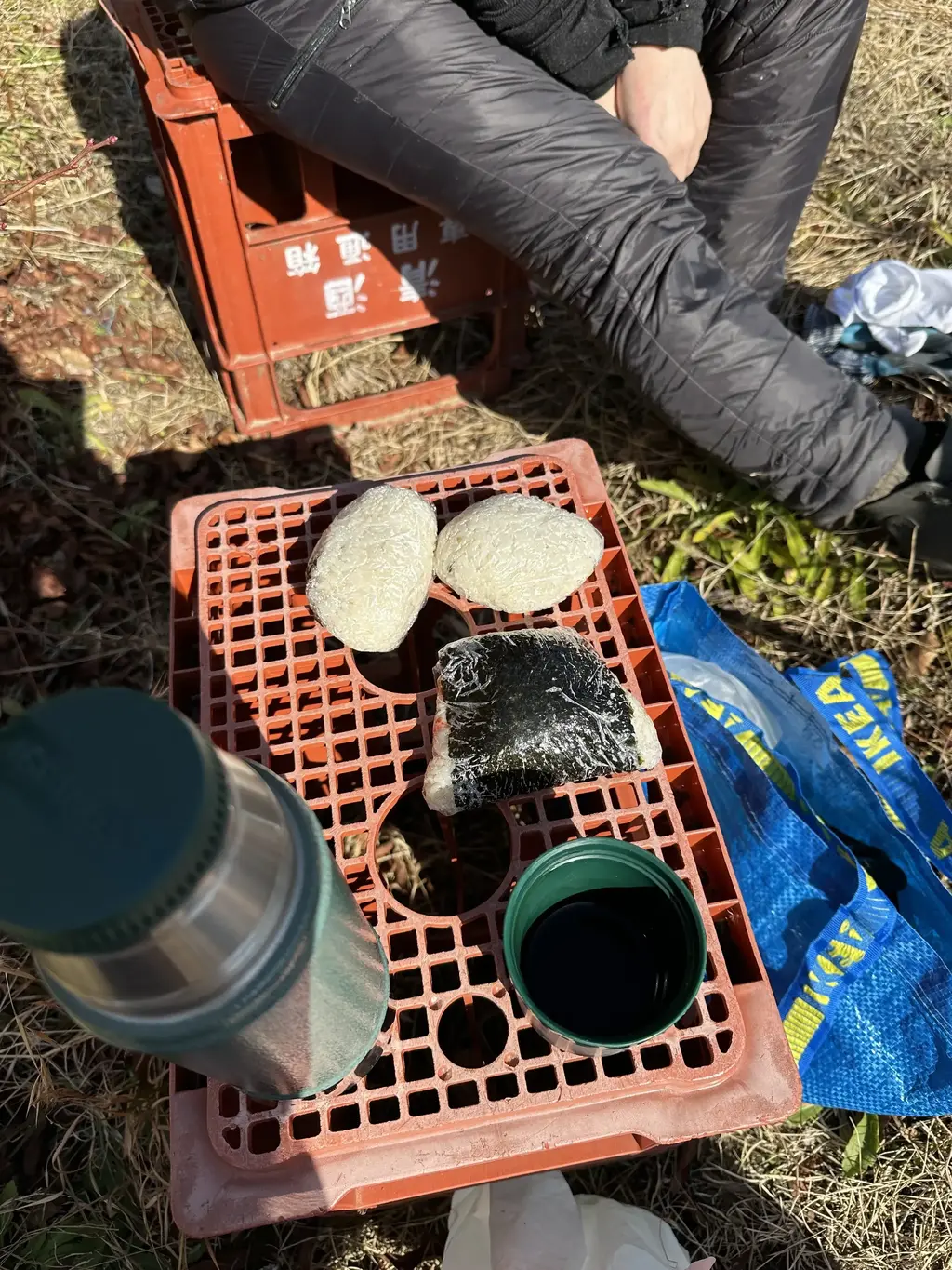 カゴをひっくり返して、簡単な台をつくる。 その上に、お昼のおにぎりを並べる。 今日は三つ。 どれも、しっかり大きい。 「でかいなあ」 妹が少し笑う。 「これくらいないと、足りひんやろ」 そう言いながら、一つ手に取る。 冷たい空気の中で食べるおにぎりは、どうしてこんなにおいしいのだろう。 白いごはんの甘さが、やけにはっきりする。 二つ目に手を伸ばしかけたとき、妹が言った。 「それ、海苔ついてるやつやで」 見ると、一つだけ、きちんと海苔が巻いてある。 「ほんまや」 「たぶん、それ当たりやろ」 少しだけ迷ってから、そのおにぎりを手に取る。 かじると、中にしっかり味のついた具が入っていた。 少し豪華なやつだ。 「これ、ええやつや」 思わずそう言うと、妹が笑う。 「やっぱりな」 なんでもないおにぎりのはずなのに。 一つだけ違うと、それだけで少し嬉しくなる。 冬の畑の中で食べる、それだけで特別になる。 風は冷たいけれど、空はよく晴れている。 手はかじかんでいるのに、心はどこかゆるんでいる。 こういう時間があるから、また作業に戻れるのだと思う。 静かな畑も。 待ってくれている木も。 そして、このおにぎりも。 全部が、同じ時間の中にある。 畑には、作物だけじゃなく、こんな時間も育っている。