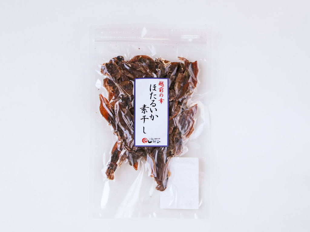「ホタルイカ素干し」は、 福井県越前町で水揚げされた新鮮なホタルイカを、余計な味付けを一切せず丁寧に陰干ししたシンプルな逸品。