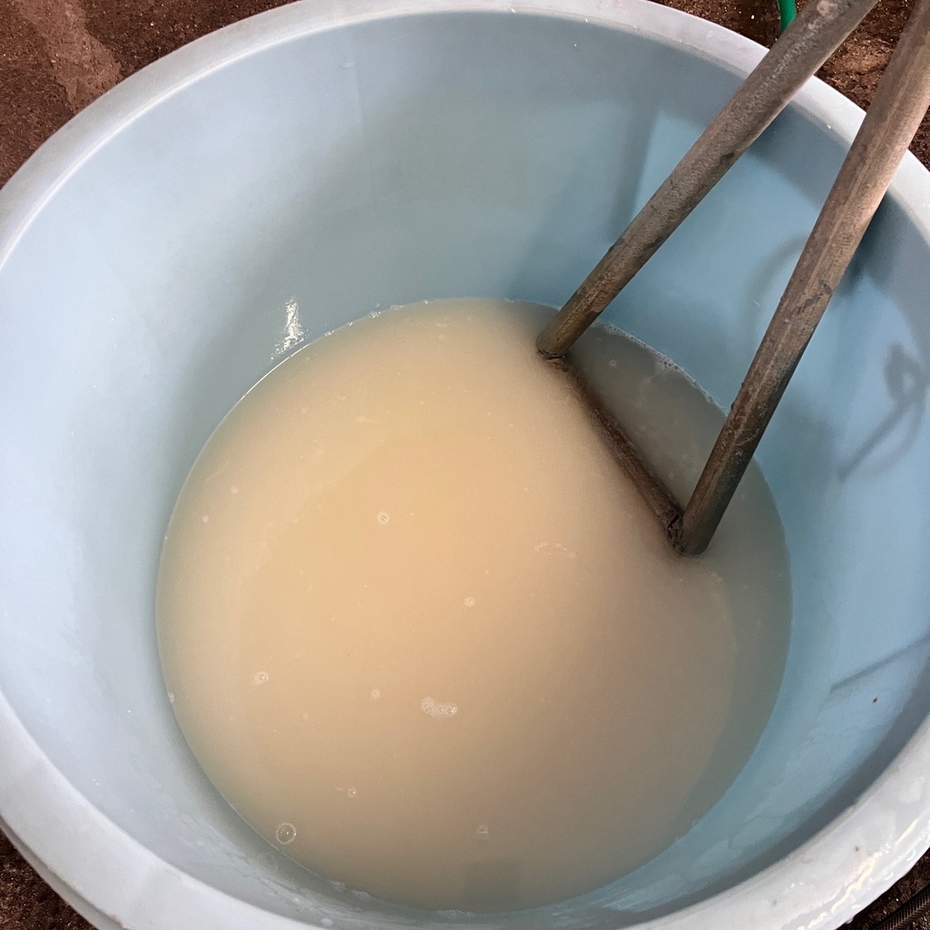 そして、その後に短い棒を使い洗い、水を変えて浸漬します。 お水の量は、お米の量の2~2.5倍ほどのかさを入れて漬けます。 浸漬時間は、季節によって変わりますが、今の時期だと16時間前後漬けます。