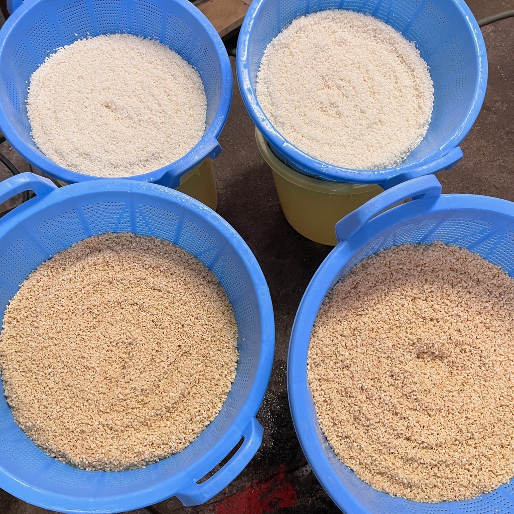 10月22日(水)。 仕込み2日目は、お米を蒸して麹菌を混ぜる作業を行います。 まず、お米をザルに上げ水をよく切ります。 はちどり味噌では、1時間以上水切りを行っています。 水切りの前に、ホースでお米に水をかけ、お米をもう一度すすぎます。
