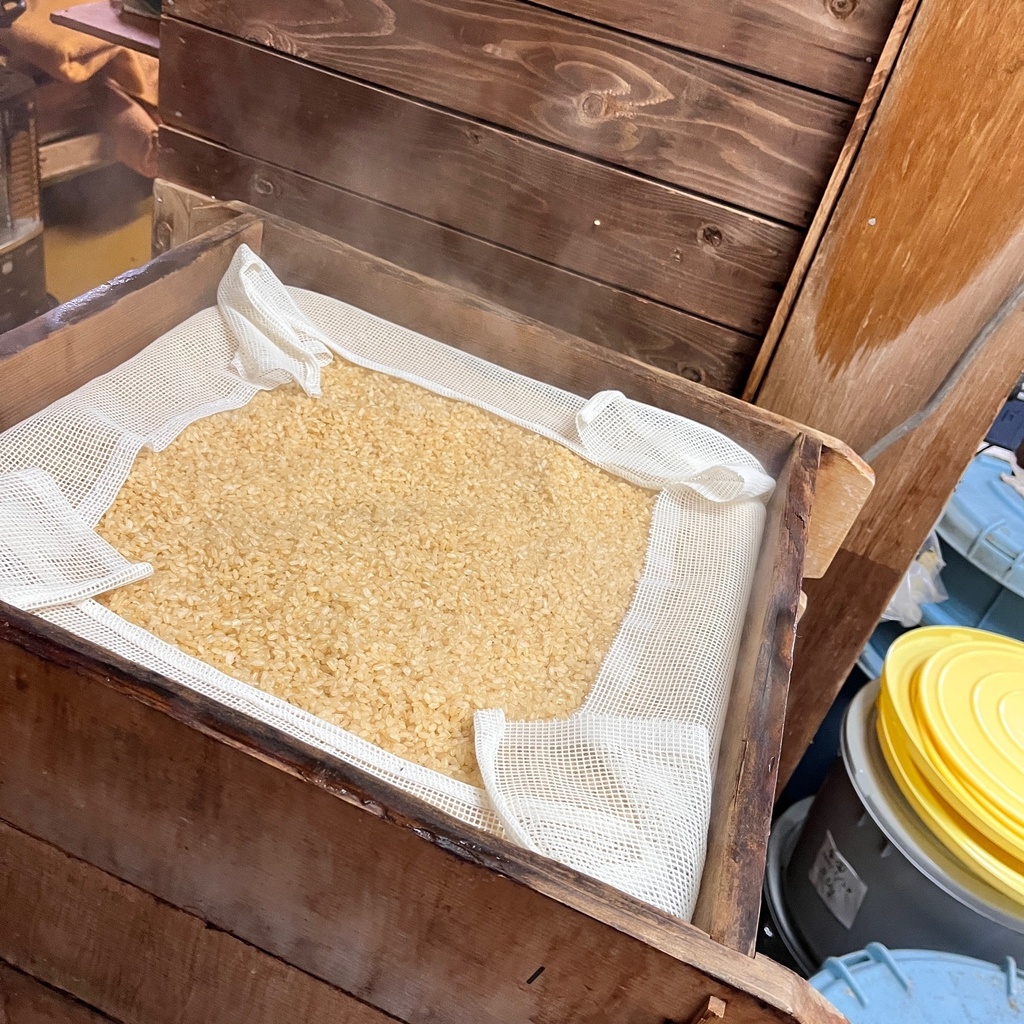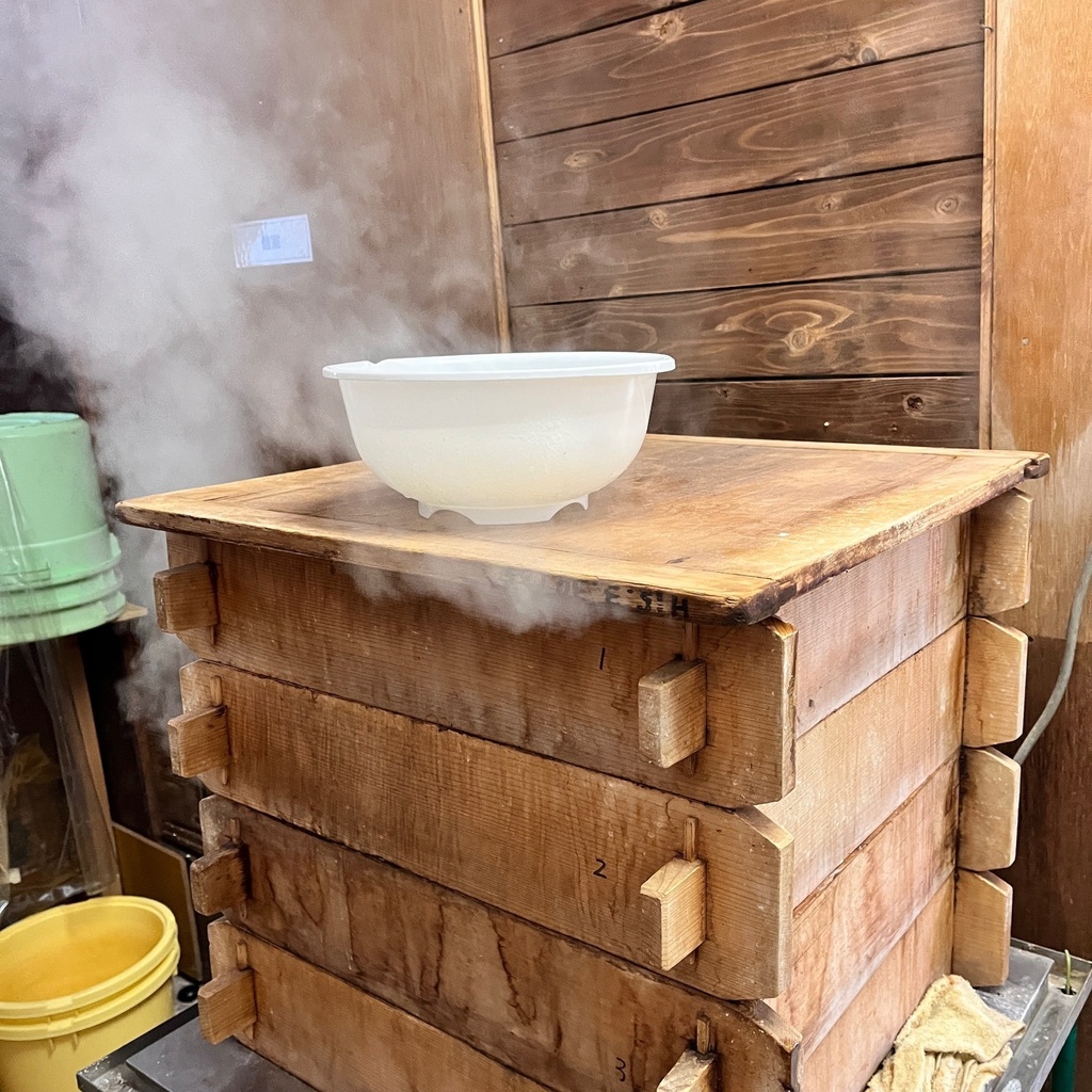 1時間以上水を切ったお米を、せいろに広げ蒸していきます。 お米の量や、白米、玄米の違いでも蒸し時間は変わってきます。 一度に蒸せる量は、約30kgまでなので、はちどり味噌で1回に仕込める最大量だと、2回蒸すかたちになります。 せいろも蒸し器も先代から引き継いだものなので、年季が入っています。 ただ、蒸し器に関しては、そろそろ寿命なようで、買い替えを検討しています。