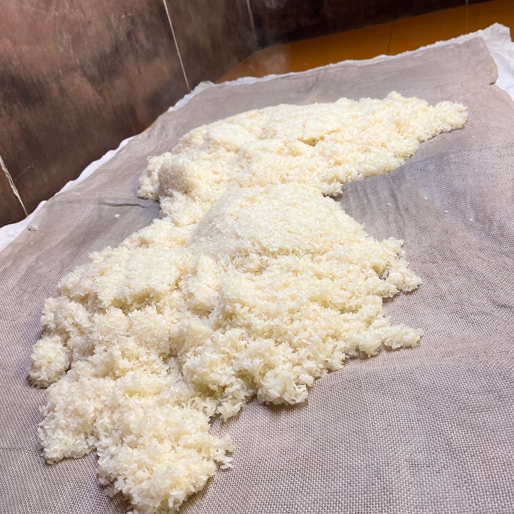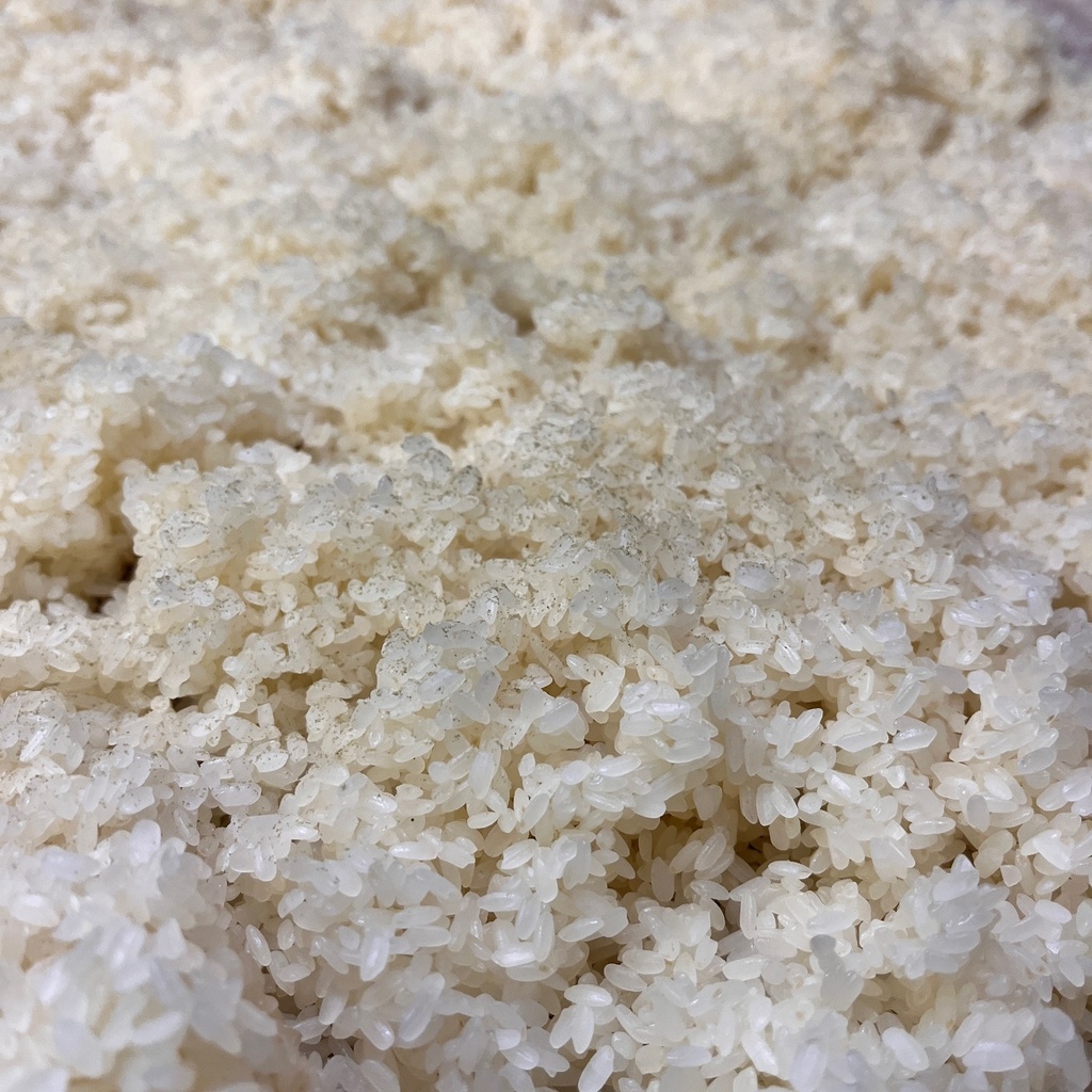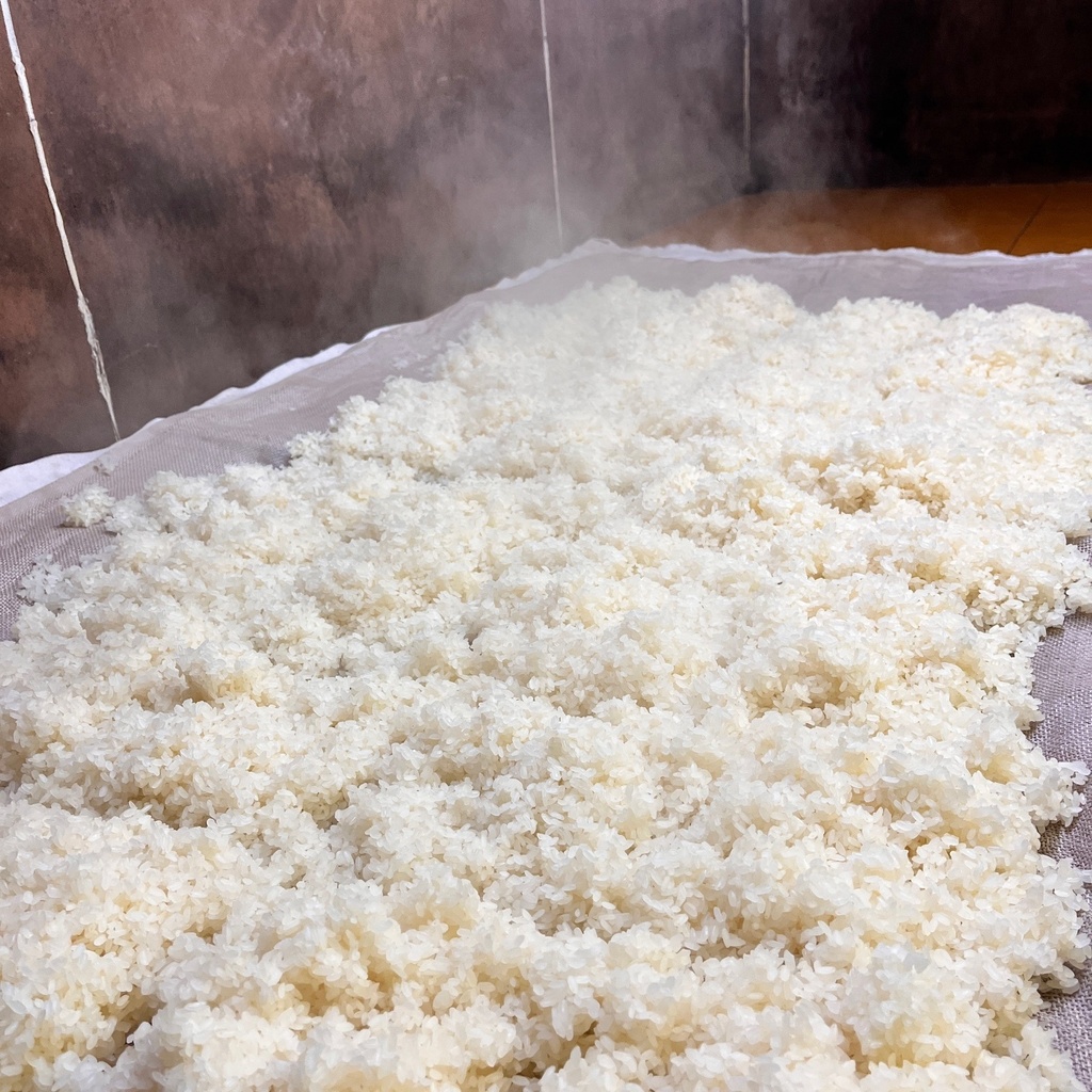 蒸しあがったお米を広げ、適温まで下げる作業を行います。 温度が高すぎると麹菌が死んでしまいますし、適温でないと上手く繁殖してくれません。 重要な作業のひとつです。 ただし、お店を開けた状態で仕込んでいるので、お客さんが来て作業が止まることもあります。 いつも、この作業中は、「来ないで」と願っています。