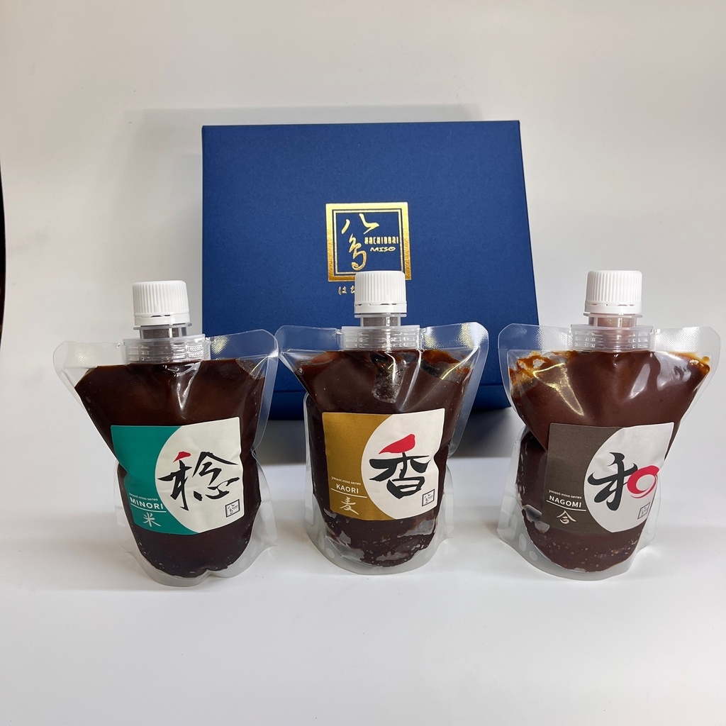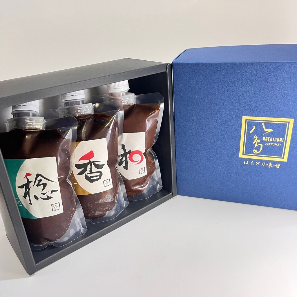 米みその「やさしいMISO稔(みのり)」、麦みその「やさしいMISO香(かおり)」、合わせみその「やさしいMISO和(なごみ)」の3種類のお味噌が入った、はちどり味噌渾身のみそギフトボックスです!