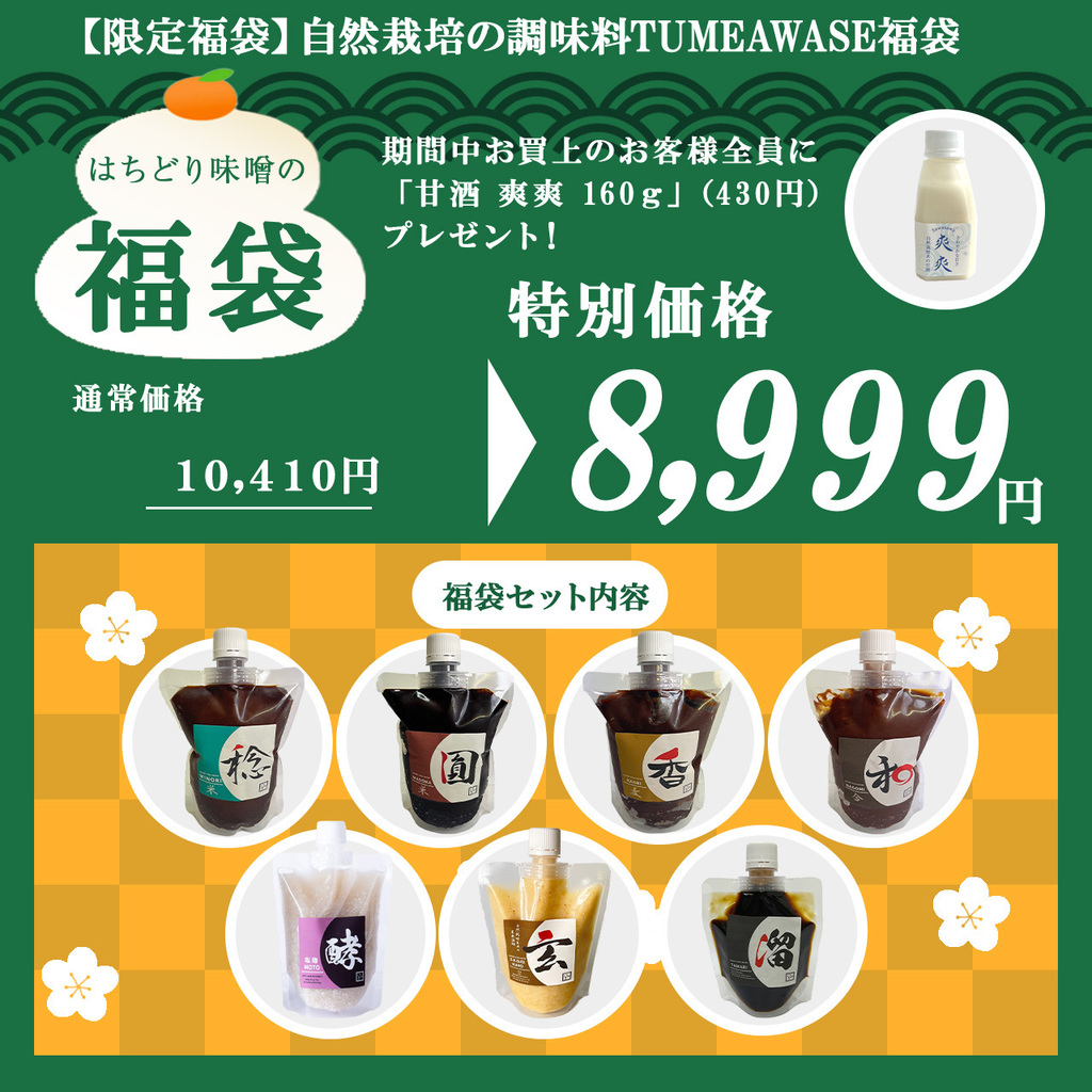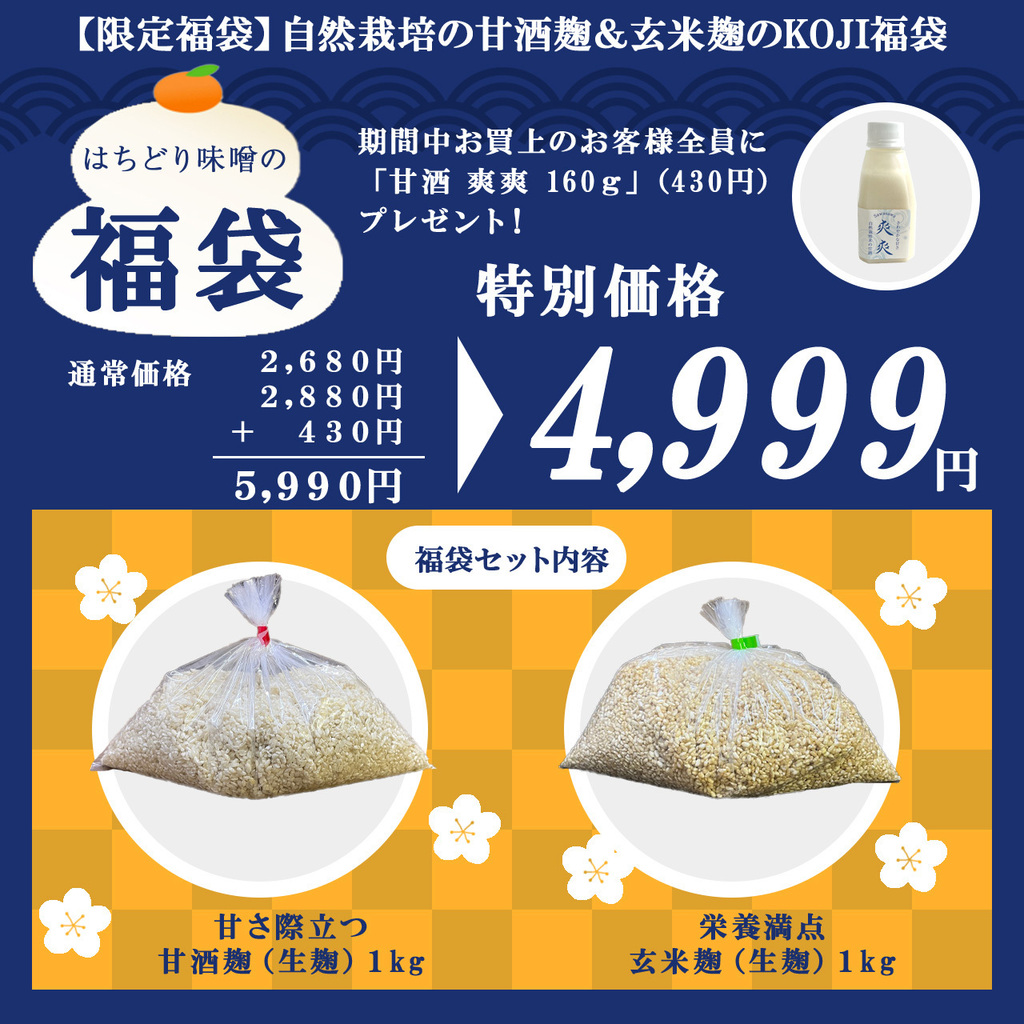 また、はちどり味噌オリジナルキャンペーンとして、福袋をご購入の方の中から抽選で 【【【3名様】】】に 甘酒 爽爽 500g×2本(自然栽培米の甘酒麹で仕込んだ甘酒) 甘酒 玄人 500g×2本(自然栽培玄米の甘酒麹で仕込んだ甘酒) をセットにしてプレゼントいたします。