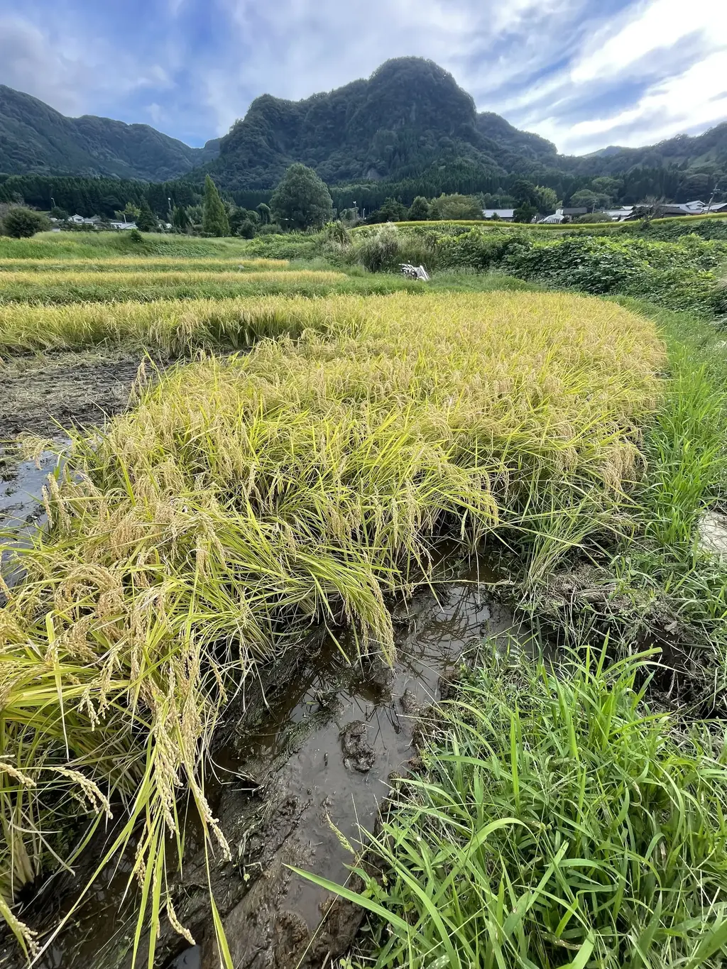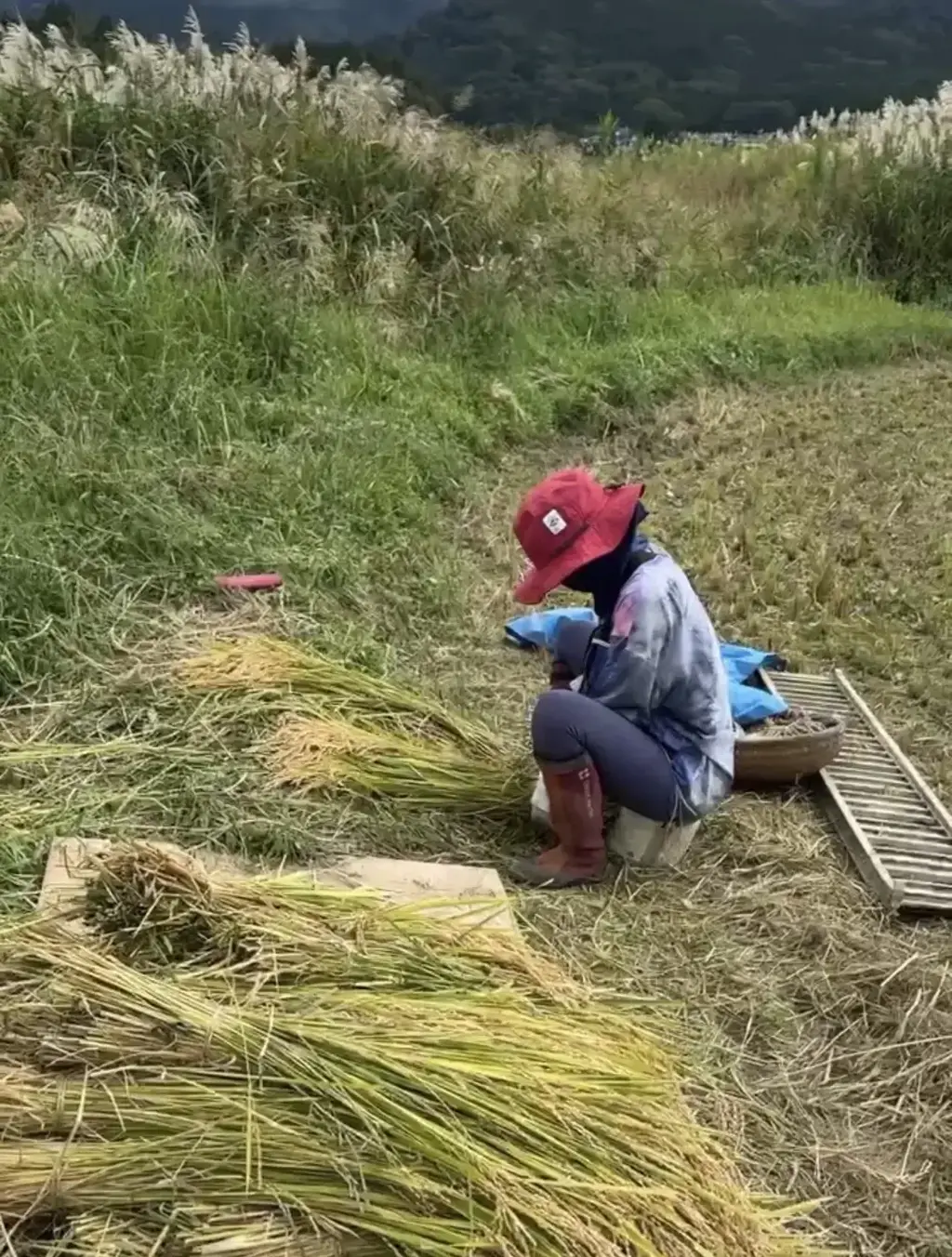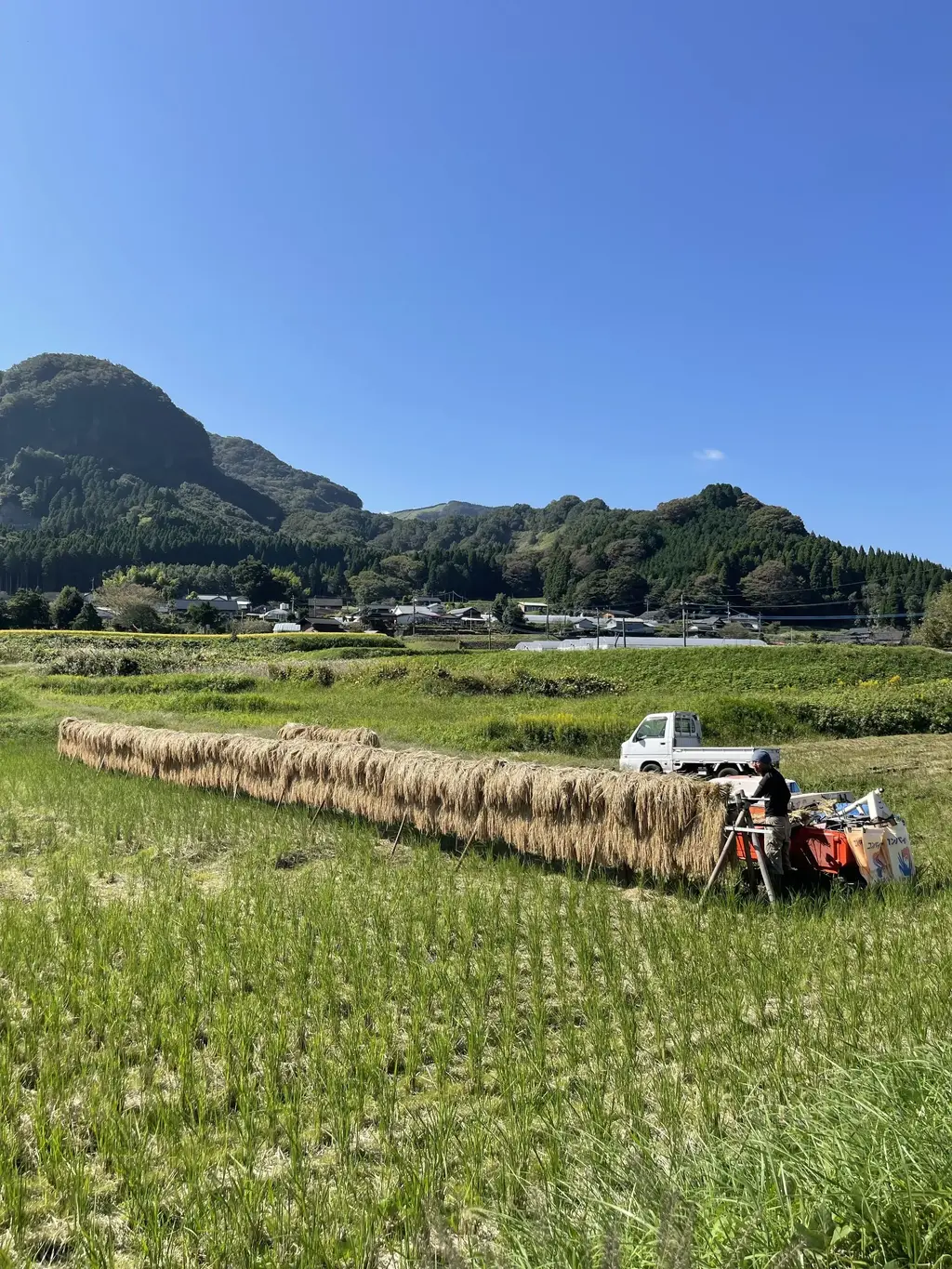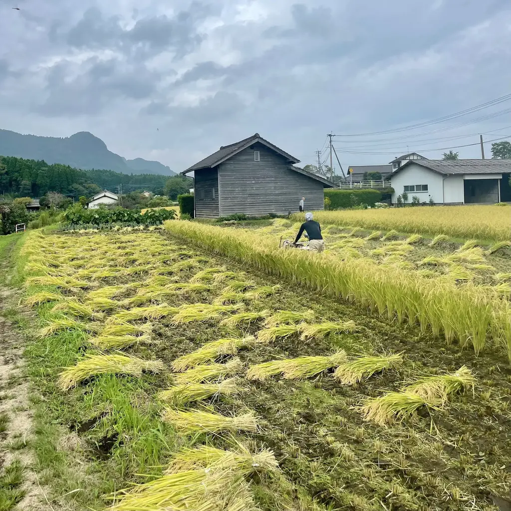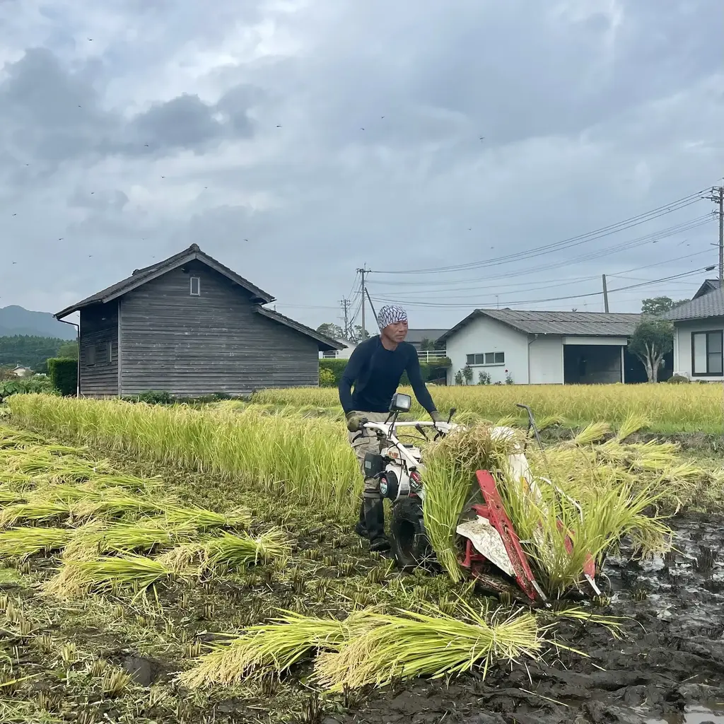 天日干しのお米は、機械乾燥で仕上げるお米とは収穫方法が異なり、コンバインではなく手押しの「バインダー」という刈りながら稲を束にまとめてくれる機械で収穫します。 収穫適期の前に田んぼの水を抜き、機械が入れるように整えますが、そのころに雨が多いと収穫は難航するので天気と時期の見極めが肝となります。