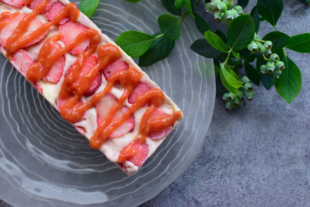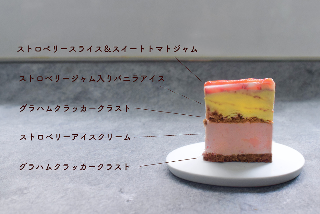 ストロベリーは生そのままを冷凍して解凍すると離水してしまって食べられなくなるので、普段の焼き菓子には使えないのですが、アイスケーキは解凍する必要がないのでこの時しか使うチャンスはないと思い、生のいちごを表面に敷き詰めました。トマトジャムとの相性もとても良いです。