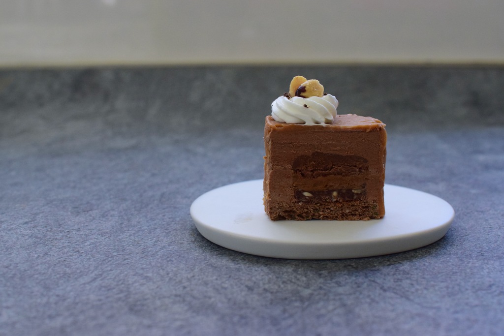 6層の構成からなるチョコートムースケーキですが、何度も何度も食感や味を試作して仕上げたものになります。