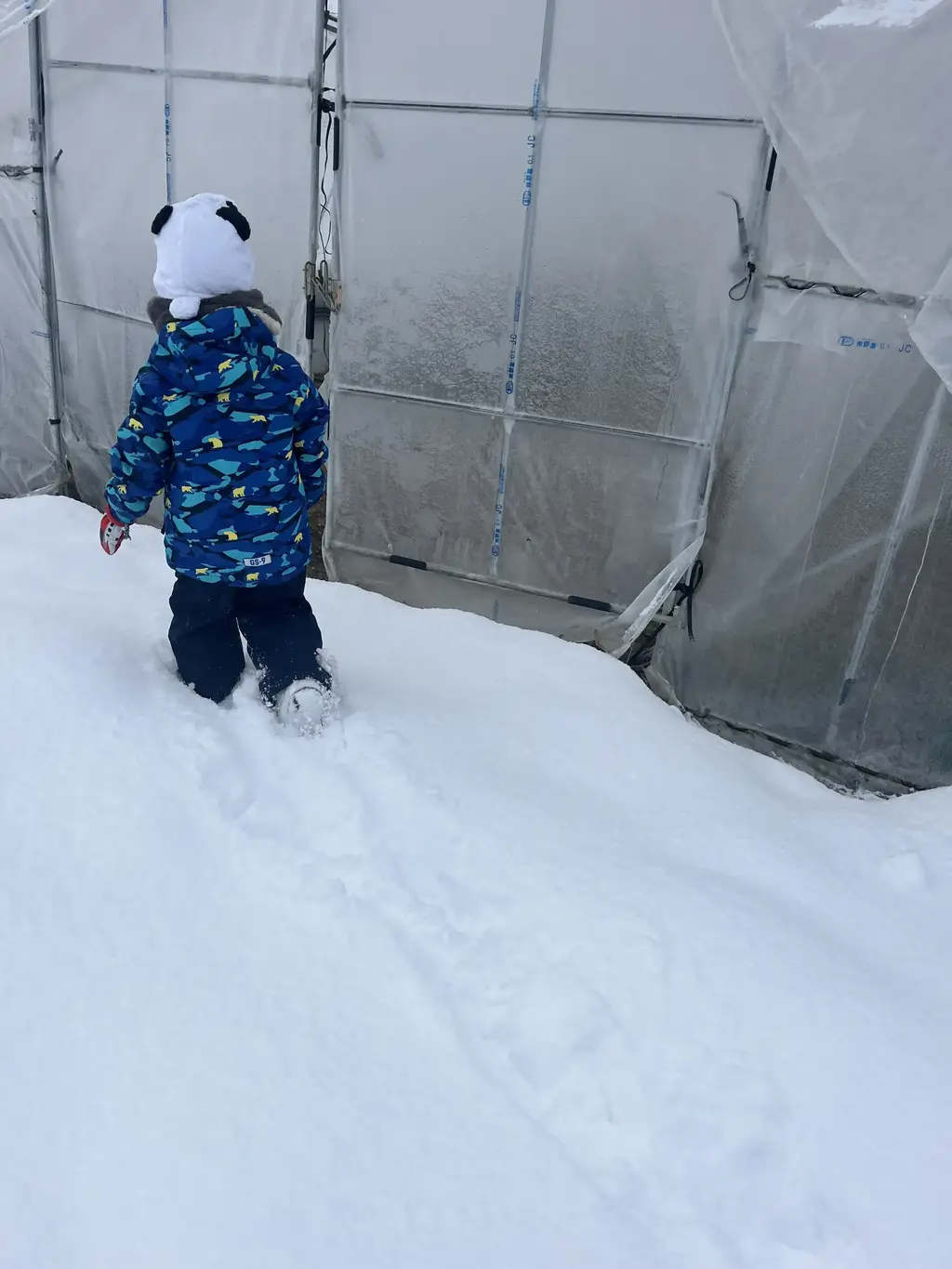 雪の中、一緒にハウスへ。 大人がやる事ってなんでも楽しそうに見えるお年頃の三男。 「これ何?どうやるの?やりたい!!やりたい!!」