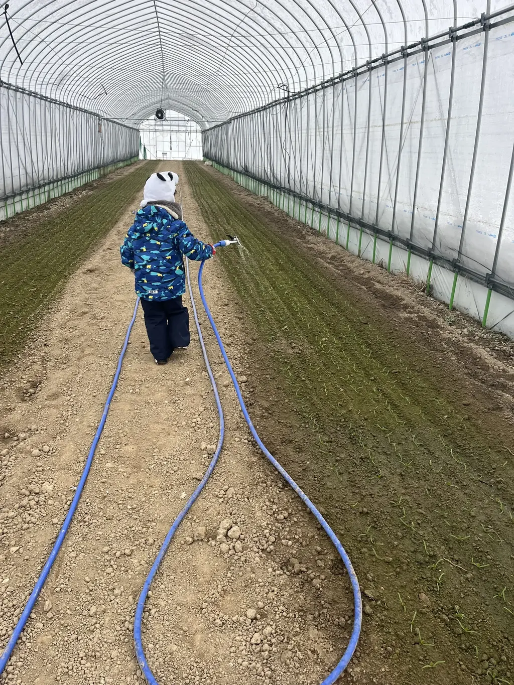 本当は自分でやった方が早いのですが、農作業は楽しいと思って欲しいので、機械を扱うことや危険なこと以外は基本的に時間が許す限りやらせてあげます。 ホースから出るお水が雨のように見えたようで 「♪雨 雨 ふれ ふれ 母さんがぁ~ 蛇の目でお迎え嬉しいなぁ~♪ チピチピ チャプチャプ ラン ラン ラン ♪」 ちょっと歌詞を間違えてるところが面白いのですが、大声でエンドレス歌唱。
