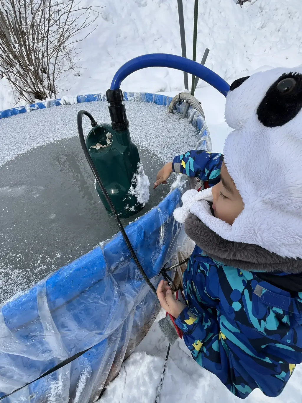 ハウスないの水やりを終えたら、タンクに水を溜めておきたいのですが、今日の気温は-5℃。大きな桶のお水が凍ってしまってお水が汲めません。そこでスコップで分厚い氷を叩き割りました。無事に給水完了し帰宅。手袋がお水で濡れてしまったので、三男の手が真っ赤になっていました。