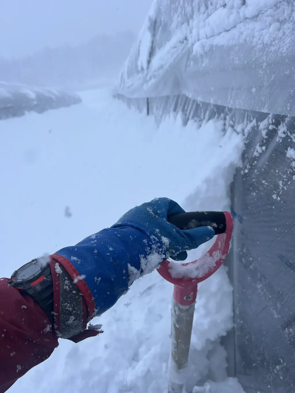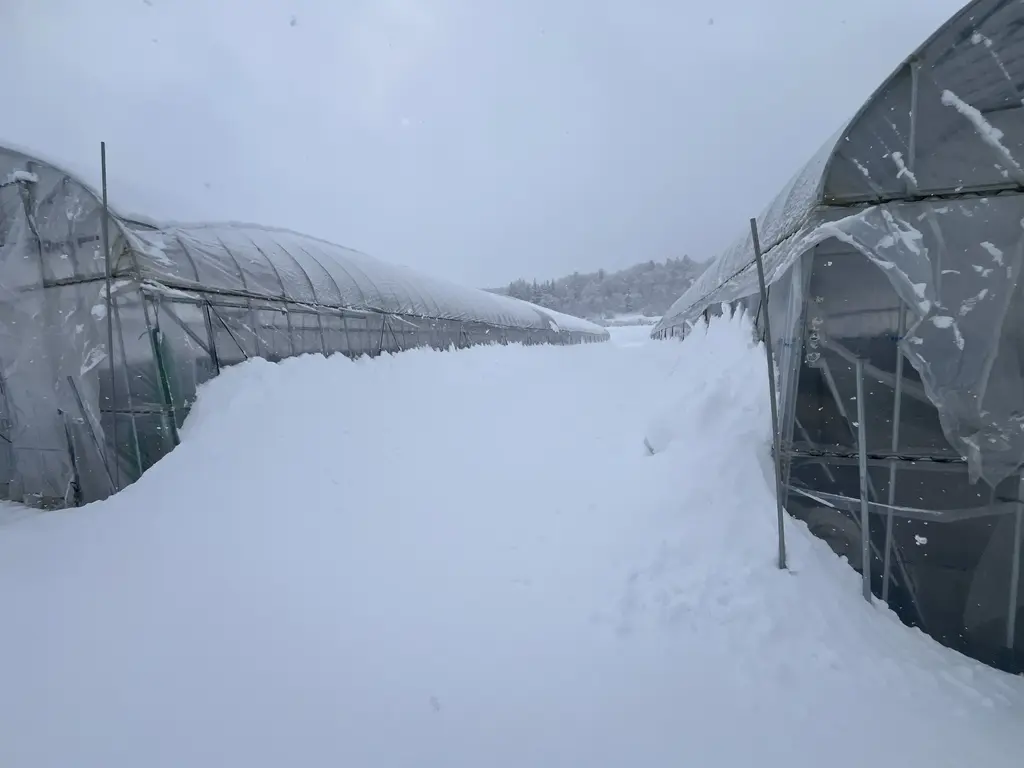 1月から雪が降り続き、だいぶハウスの姿も隠れてしまいました。宙を舞っている時の雪はフワフワ軽いのに、降り積もった雪は驚くほどの重さがあるんです。