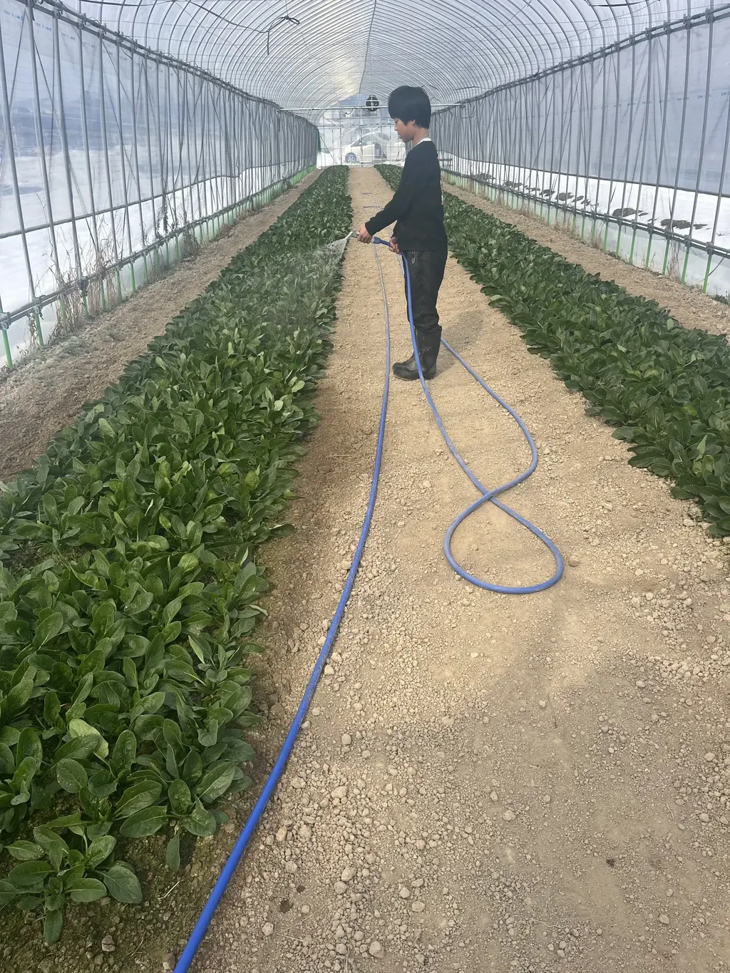 ハウスは50mもあるので、使用しているホースもとても長いです。水をかけるのも楽な作業ではありません。三男ではホースを引っ張ることも難しいです。ここは流石の長男!!ハウス1棟分全て1人で水やり作業をしてくれました。「疲れたら代わるよ」と声がけしても「大丈夫!」と黙々と作業を続けます。水をあげる量や、水圧の調整もバッチリで、ほうれん草達が生き生きとしていました。