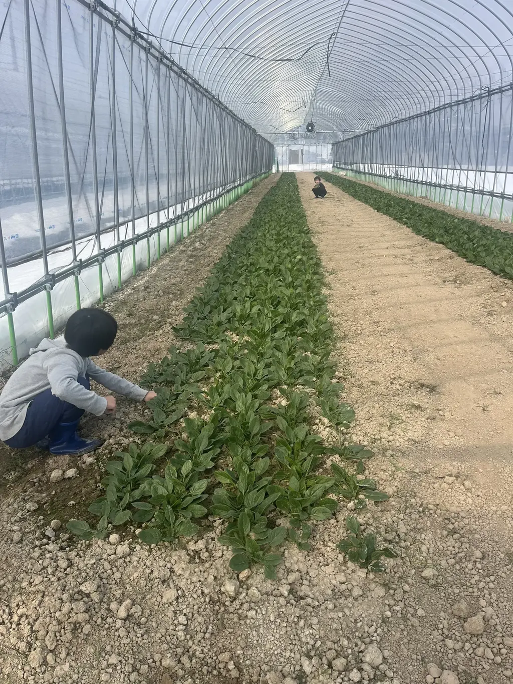 隣のハウスでは次男と三男が除草のお手伝い。鬼滅の刃の全集中のお話をしながら作業をすると、草取りも全集中でしだす子ども達。素直で本当にいい子達です。とは言ってもそんなに長く集中が続くわけでもありません。ハウスの中で走り回ったり、土を投げたり、雪をもってきて溶かしてみたり。