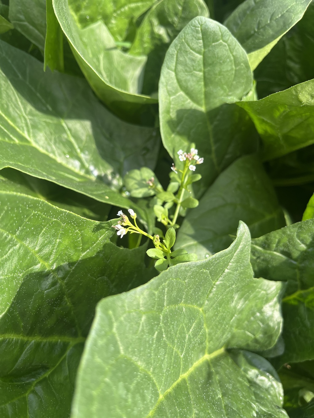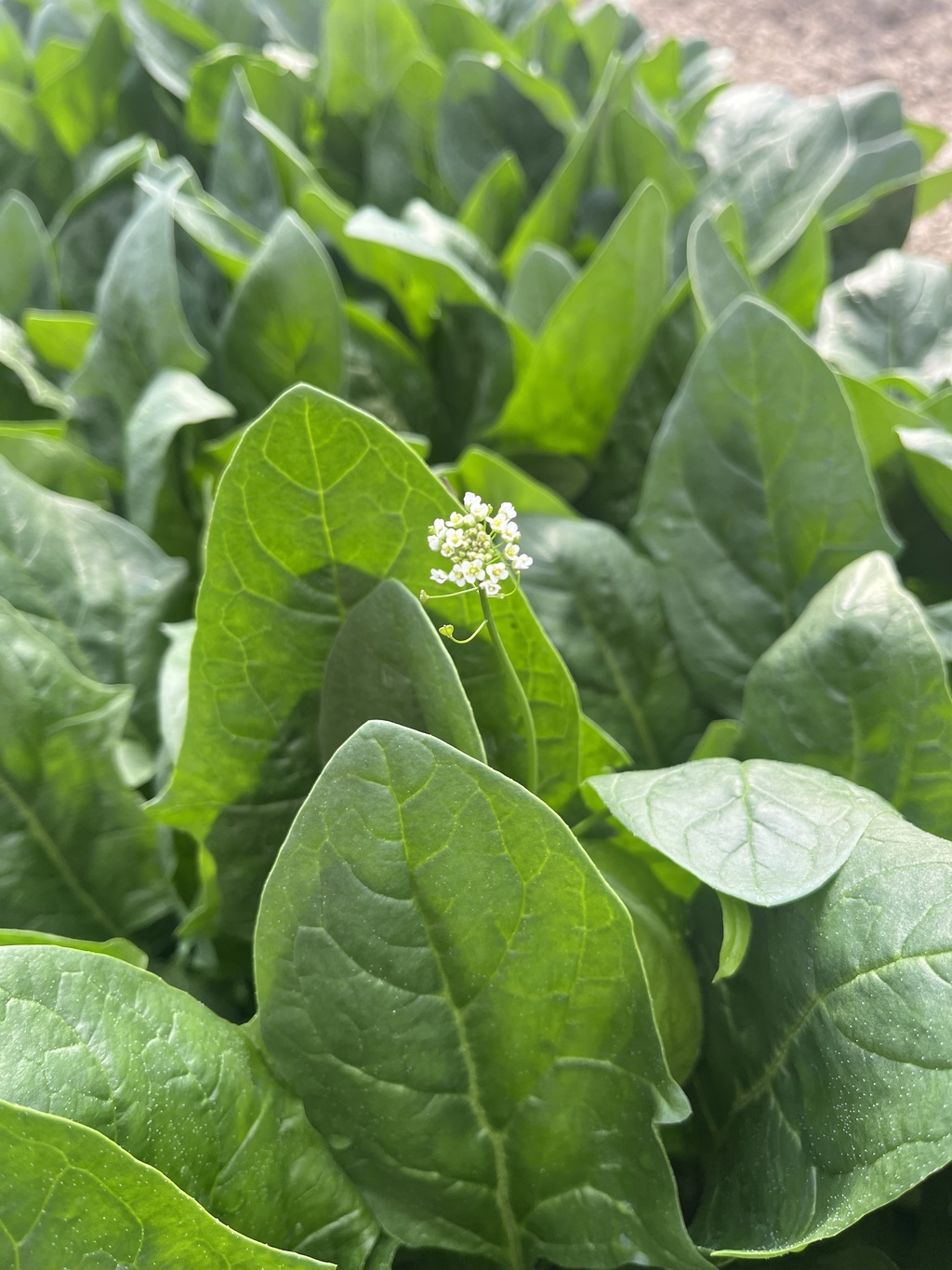 それから2か月くらい経ち、もうすぐ収穫だという頃から雑草の勢いが増してきました。これまでほうれん草の影に隠れていた雑草の葉が、ちょこちょことほうれん草の背を超えてきたのです。