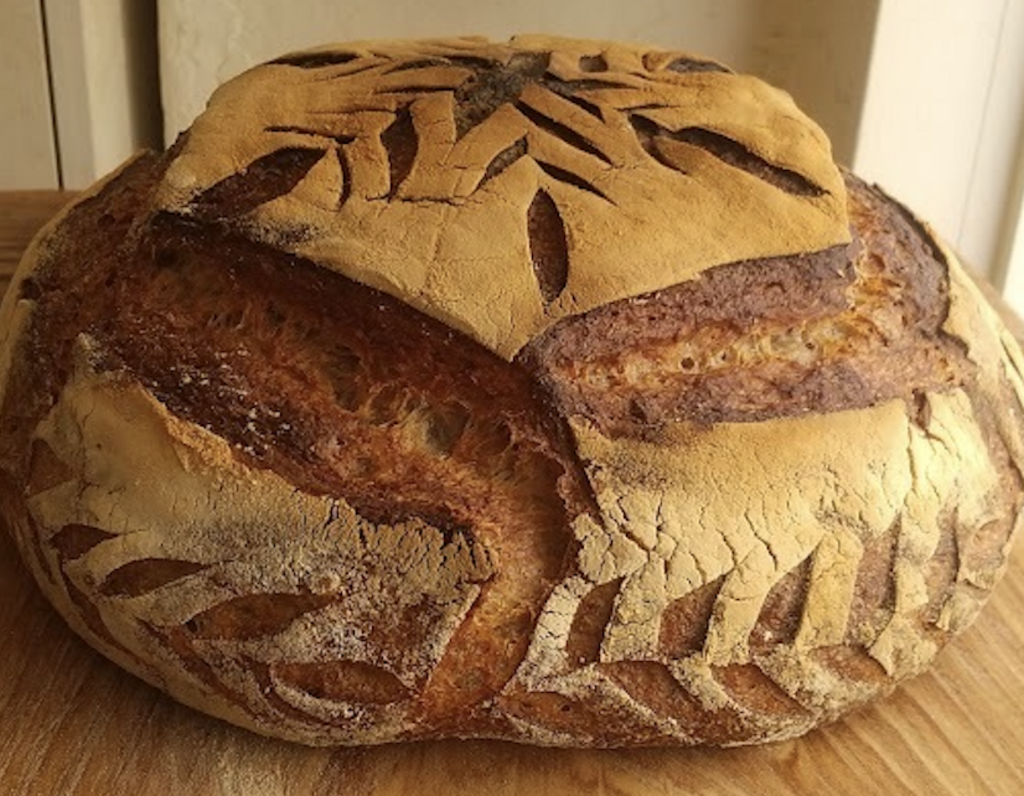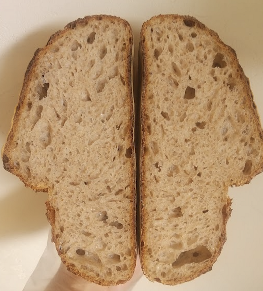 ・メイラード反応(生地内のたんぱく質と糖質が高温で起こす化学反応のことで、旨味成分が増幅します)が起きるよう、焦げる寸前まで待って窯から出すようにしています。 ・表面パリッと中はもっちりジューシー。粉・乳酸菌・酵母が噛み締めるごとに香ります。 ・乳酸菌が小麦たんぱくを旨味成分のアミノ酸に分解しているので旨味たっぷりです。 ・サワードゥの表面に出来る好気性菌の一種「酢酸菌」は、パン生地を酸っぱくする原因です。それが発生する前に良くかき混ぜてフレッシュな状態で使用しているので、生地の酸っぱさはある程度抑えられています。