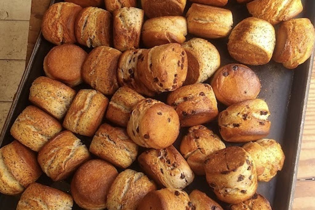 こちらの粉に水・圧搾菜種油・ゲランドの塩・サワードゥを足して捏ねて発酵させた食パン生地を薄く伸ばし、ソイレブール(豆乳クリームバター)・有機砂糖・有機シナモン・有機カルダモンで作ったペーストを塗り、二つに折り畳んで細く切り、くるっと捻じって成型して焼成しています。