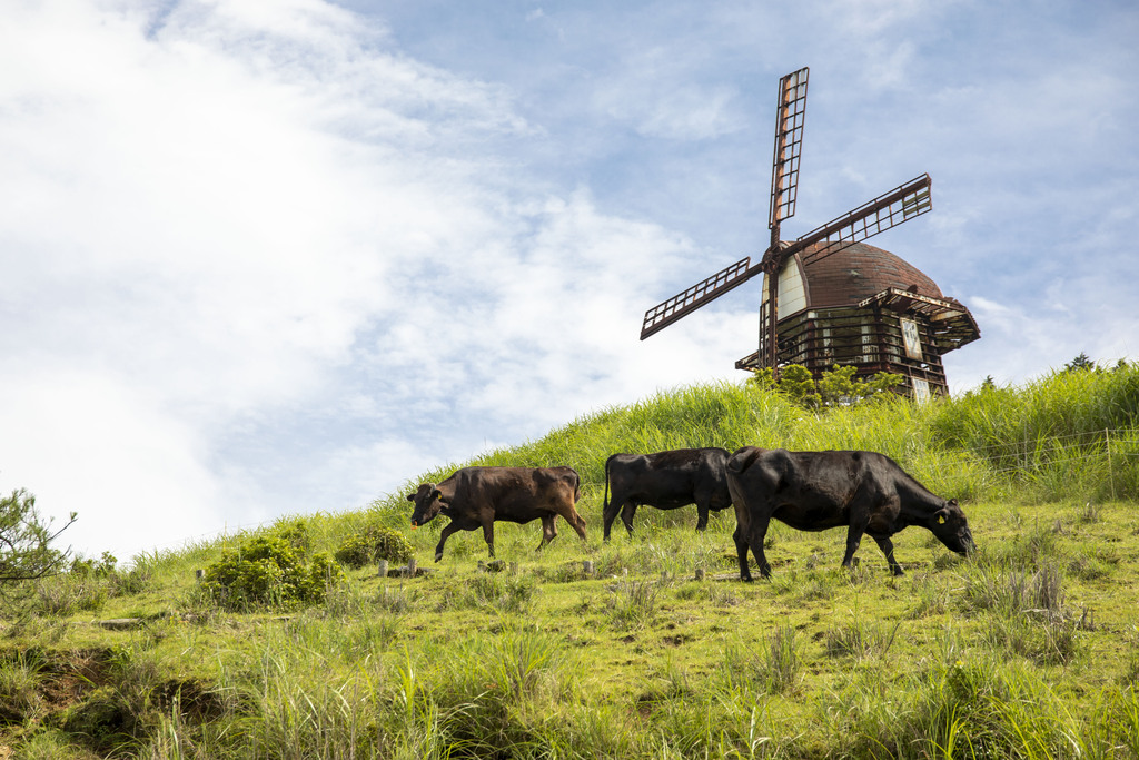標高645m宮崎県延岡市の鏡山山頂で黒毛和牛を生産しています。 国内の食肉牛では珍しい「放牧スタイル」。