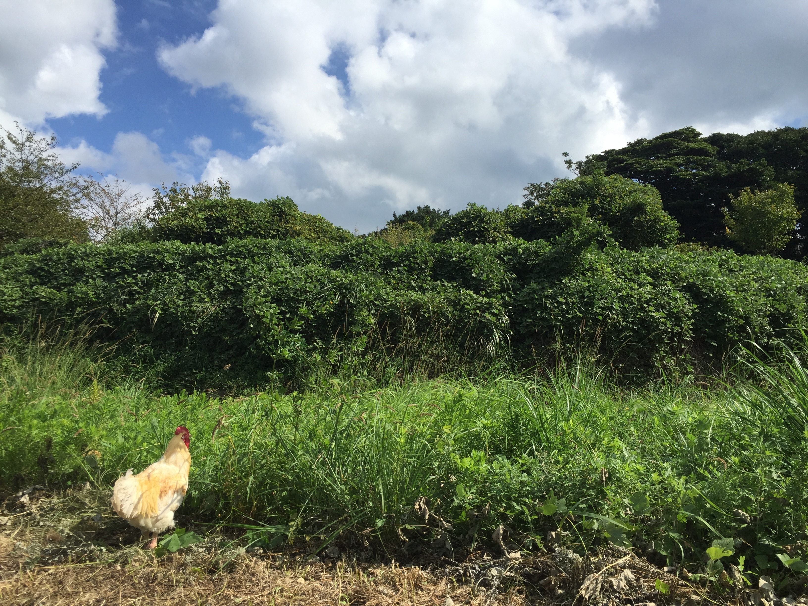 薮化した耕作放棄地を活用し、ニワトリたちは放し飼いでストレスなくのびのびと暮らしています。