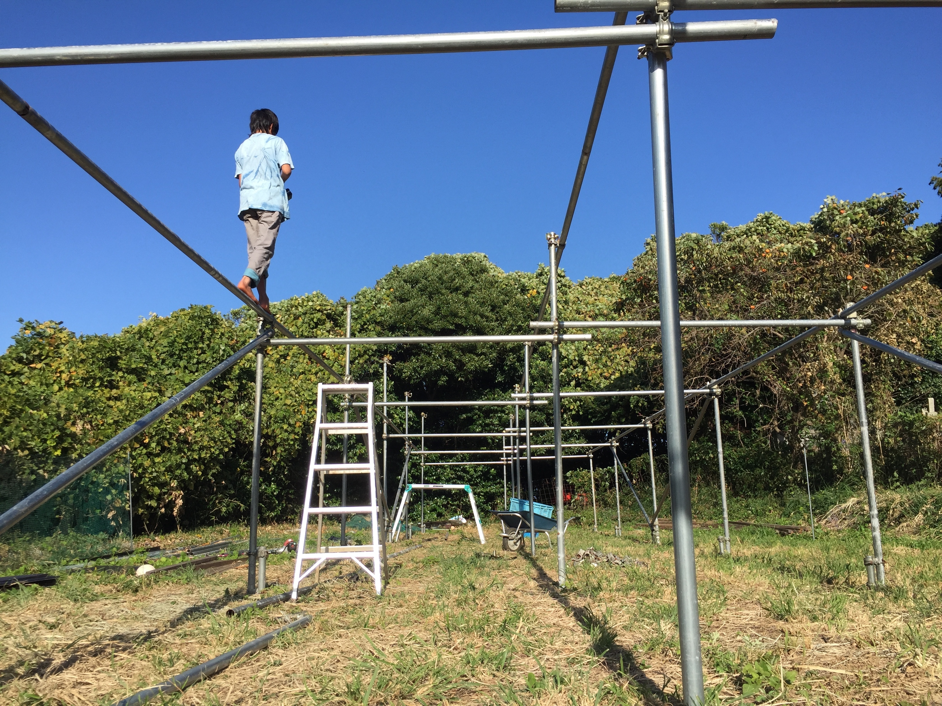 鶏舎は子供と一緒に二人三脚で建てました。リユースやリサイクルは自分のライフワークでもあり、ほとんど廃材を集めて手作りしたものです。放牧地を囲うネットは漁師の網やブイをリサイクルして作成しました。