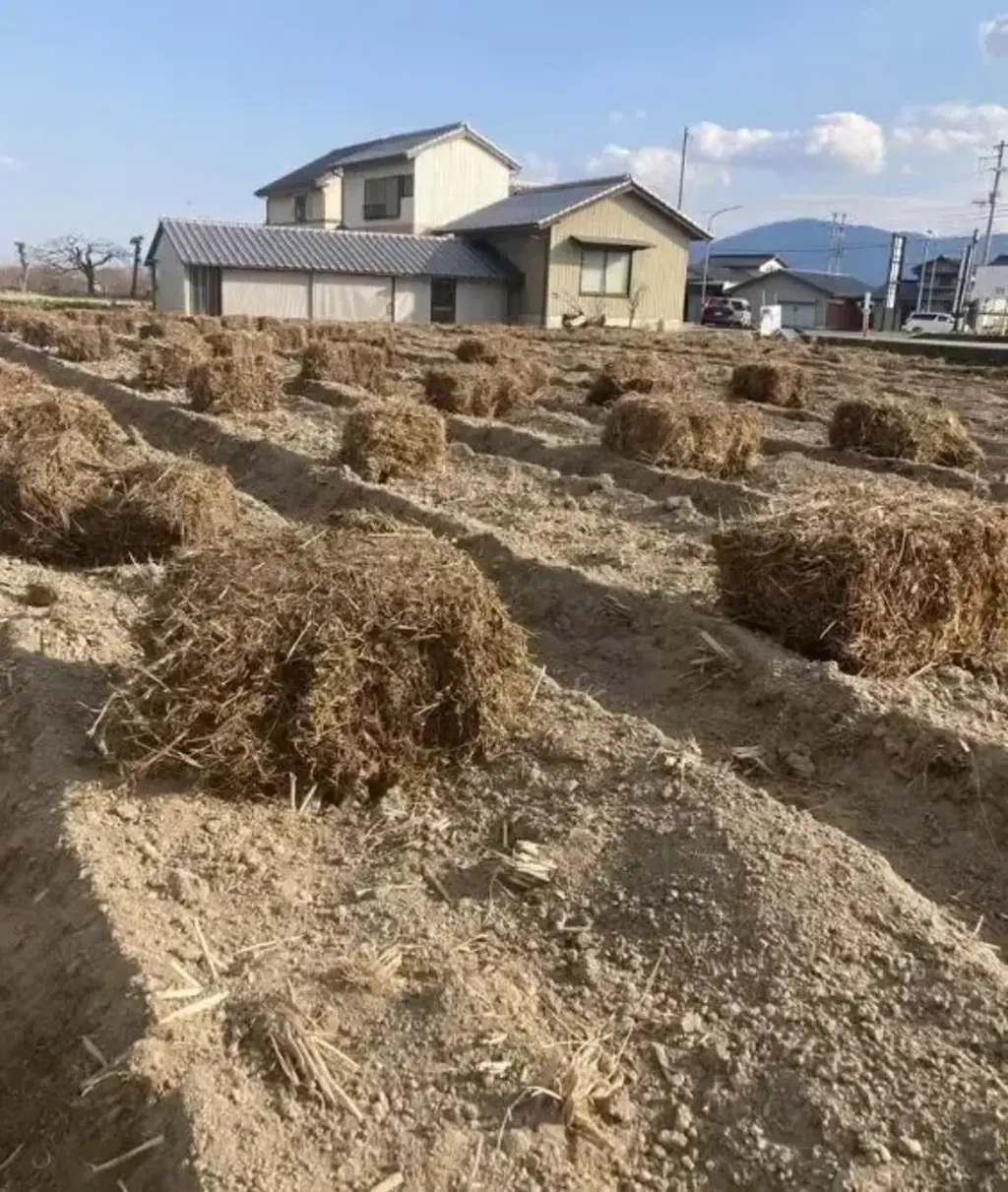 うちはできる限り、なんとな~く畝が上がったら、そこへ地元の吉野川の河川敷に、定期的に作られる刈草ブロックをいただいてきて、それを畝の上に広げます。