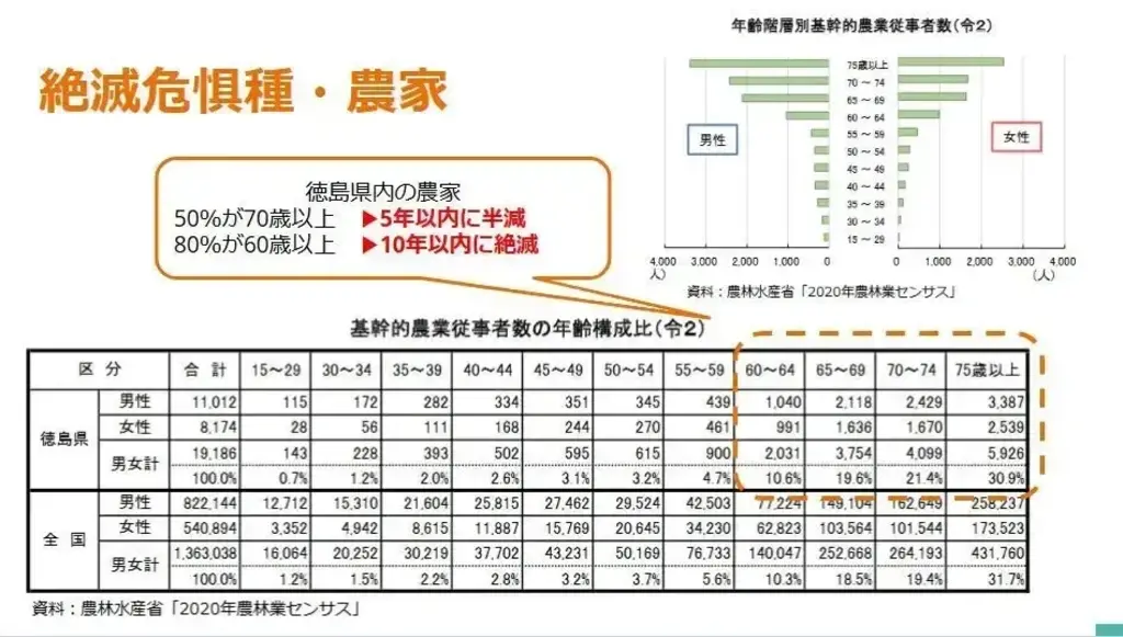 ちょっと古いデータですでに6年前。2020年に発表されたものです。 この時点で、徳島県…いや、全国の農家の半数が70歳以上。そして80%が60歳以上なのです!!6年後の今は… 半数が76歳以上、80%が66歳以上ってことに!!!