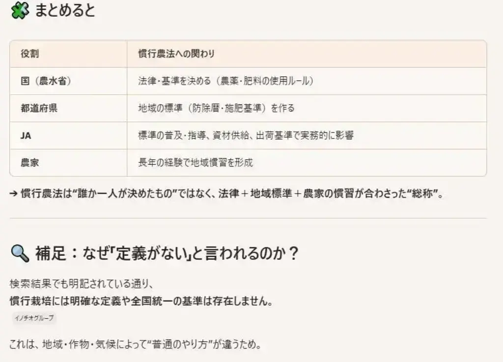 さて!いよいよ最後、慣行農法を見てみましょう。わかっているようでわかっていない慣行農法・・・困った時のコッピ―(Copilot)くん!に、慣行農法とはなんぞや、と聞いてみた。画像はその回答から抜粋。