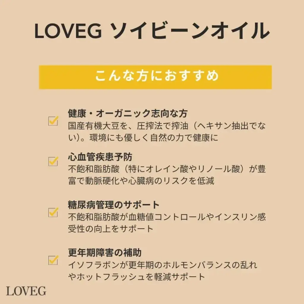 大豆は、全体の20%程度の油が含有しており、ゴマなどは50%の含有率ですから、効率がそれほど高くないため、圧搾した大豆油を販売する方は少なく、国産有機丸大豆を使用した圧搾大豆油を販売しているのはLOVEGだけ(自社調べ※2025年5月時点)