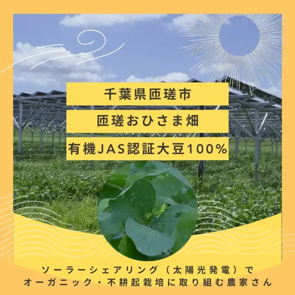 現在の日本では、大豆畑単体で農家さんが生計を立てていくことが非常に難しく(日本での大豆畑が衰退した理由の一つでもあると思います)、太陽光でクリーンエネルギーを発電し収益を得ながら、有機農法で作物を育てておられます。