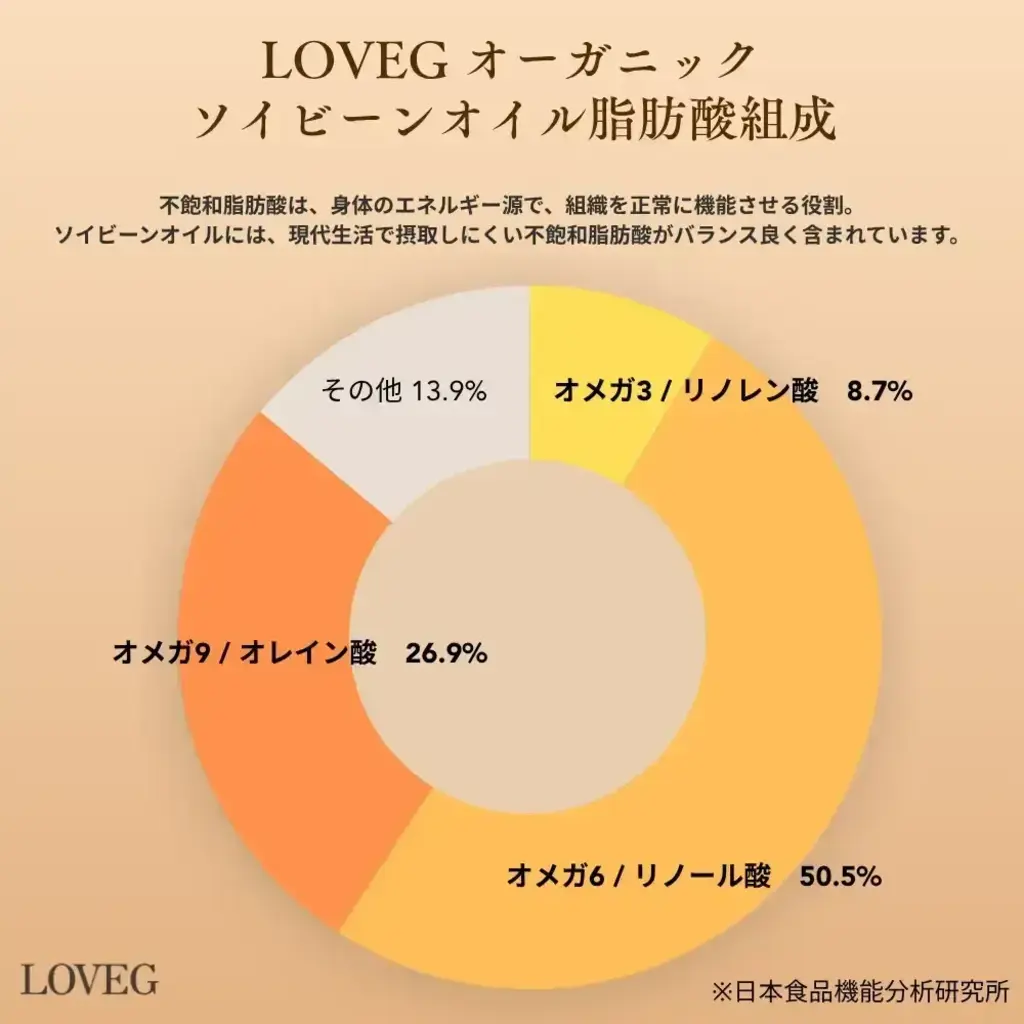 大豆オイルは不飽和脂肪酸が豊富で、特に多価不飽和脂肪酸(オレイン酸(オメガ-6)、リノール酸(オメガ-9)、リノレン酸(オメガ-3)が含まれています。 これらの脂肪酸は心血管の健康維持に寄与し、コレステロール値を改善する効果があると言われております。