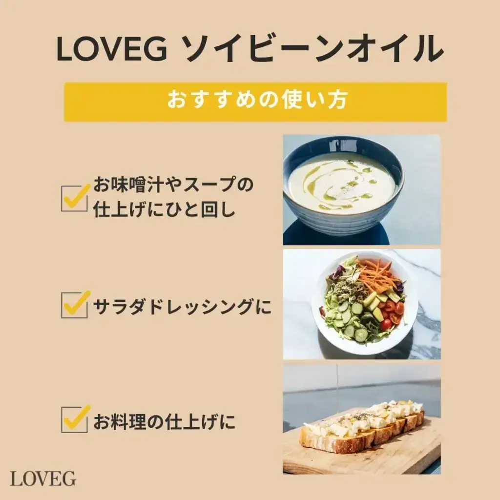 栄養特徴を活かし、スープ(味噌汁がおすすめです)の仕上げに垂らしたり、揚サラダドレッシングやブレッドにつけての生食や、げ物など火を使ったお料理では、軽さと香ばしさが食材の旨みをより一層引き出してくれます。 さまざまなお料理に幅広く使用できます。北海道の大地の恵を是非、食卓でお楽しみください。 希少な国産有機大豆油をぜひ楽しんで、健康的に美味しくお過ごしください。