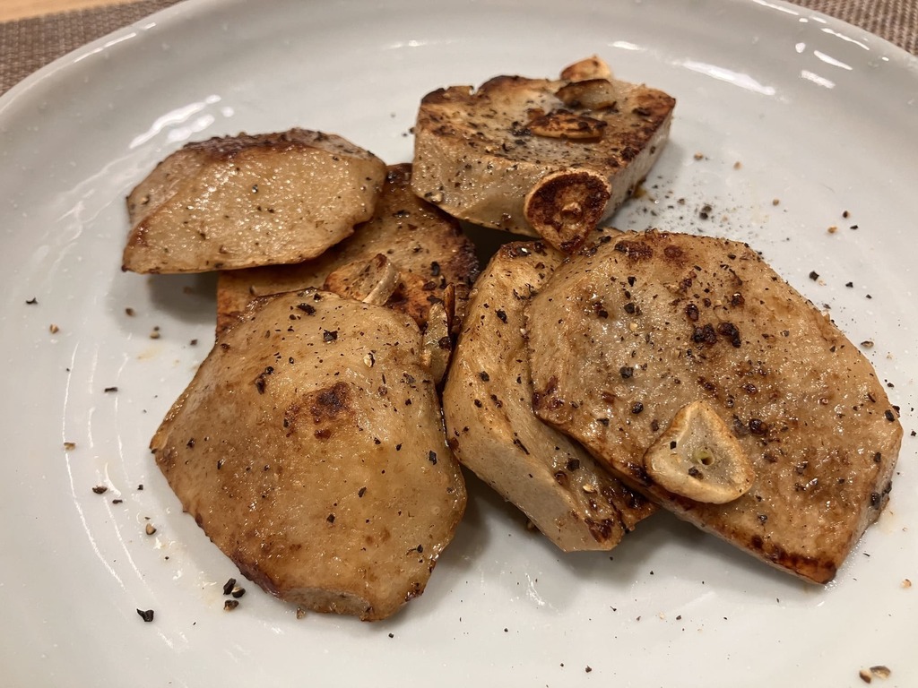 普通は親芋を食べないようなのですが、このからどり芋は親芋も美味しい品種(地元ではむしろ親芋しか食べない?)になります。味噌汁の具にすることが多いのですが、今回食べていただきたいのは、フライパンでカリッとソテーしたステーキ風です!! お料理は結構簡単で、頭の部分をザクっと切り落として皮をむいて、1cm幅にスライスしたら電子レンジで火を通します。そうしたら、熱したフライパンに入れてじっくり弱火でソテーして、仕上げにお醤油を回し入れてちょっと焦がすだけ!!ね?簡単でしょ??