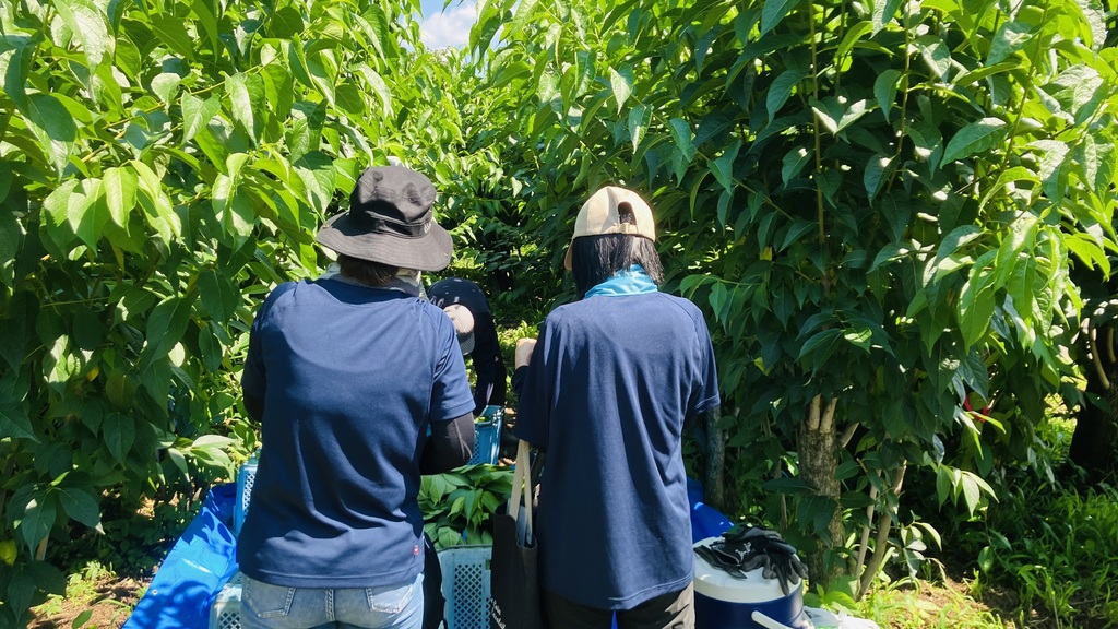 そんな中、障がい者の方々の就労支援という素晴らしい活動をされている施設のスタッフの皆さんが、杜仲葉の収穫体験に来てくださいました。皆さんは炎天下でも笑顔を絶やさず、真剣に収穫方法の説明を聞き、いざ作業が始まると経験者顔負けの手際の良さに驚かされました。スピードだけでなく、葉を傷めないように丁寧に扱う姿勢は、私たちにとっても大きな学びとなりました。