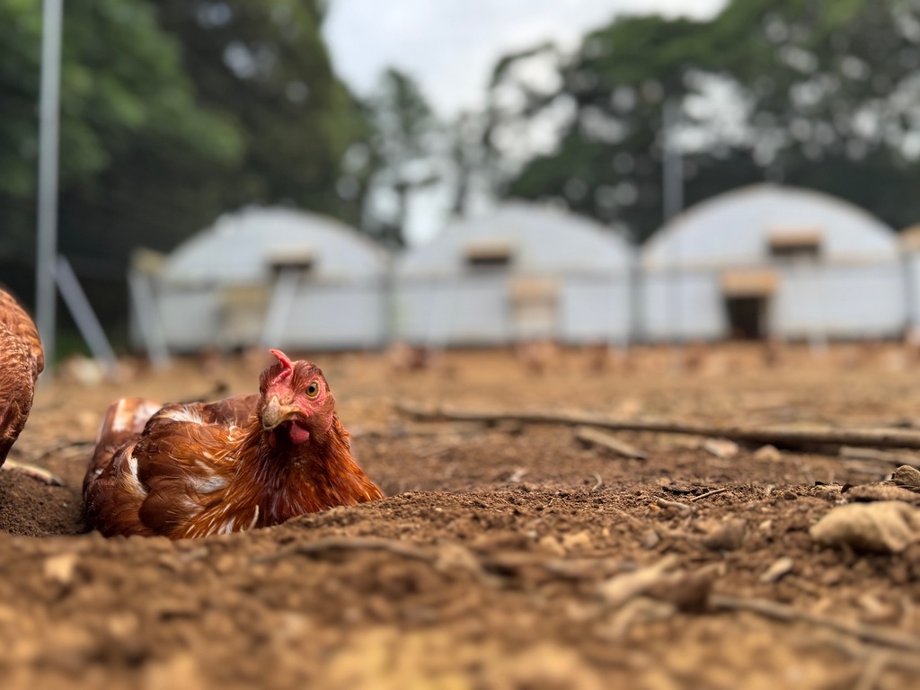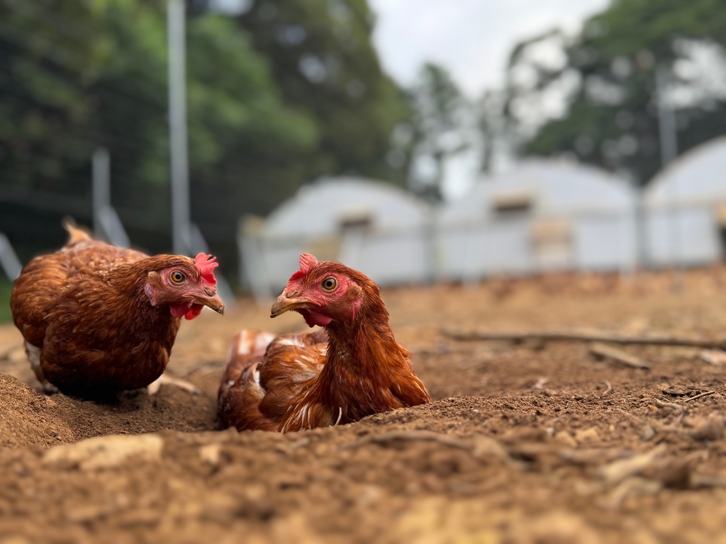 にわとりたちは一羽、また一羽と地面に腰を落とし、土をかき寄せながら体をくるむようにして座り込みます。これが彼らのお風呂、いわゆる砂浴びです。 細かい土がふわっと舞い上がり、羽の奥まで入り込むと、体についた余分な脂や虫を落とし、羽毛を整える役割を果たします。 目を細め、時には目を閉じてうっとりと動きを止める姿は、まるで温泉に浸かる人のよう。 羽を大きく広げ、ひっくり返り、土のぬくもりと香りを全身で受け止める光景は、見ているこちらまで心がほどけます。