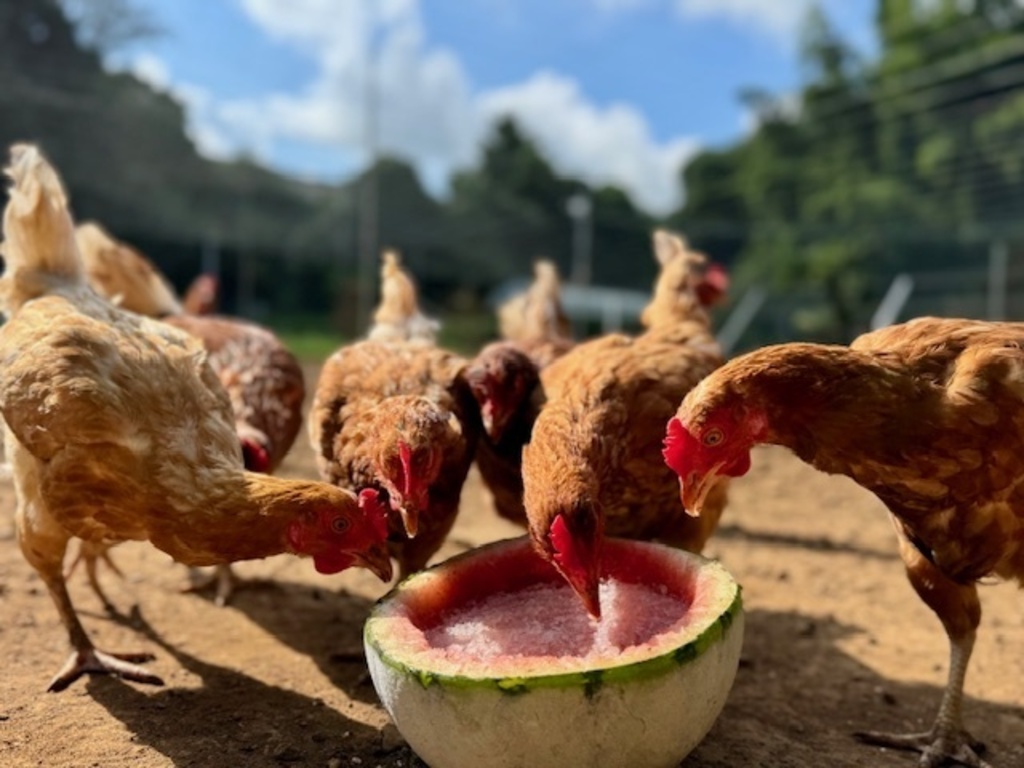 人も鶏も、夏を乗り越えるには、水分と涼が欠かせません。 強い日差しの下、作業の合間にひと休み。 冷えたスイカの香りが風にのって、 ふっと体の熱を冷ましてくれます。