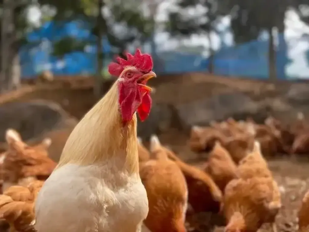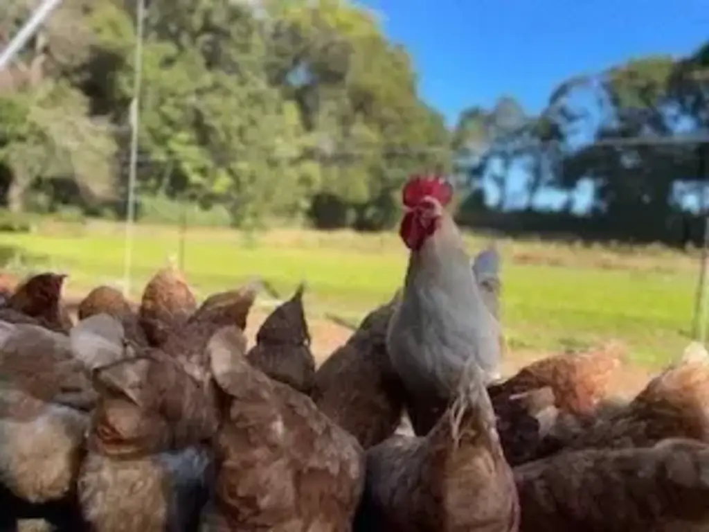 放牧場の真ん中で、 胸を張って立つ一羽の雄鶏がいます。