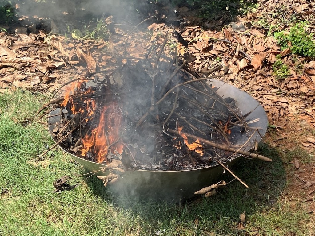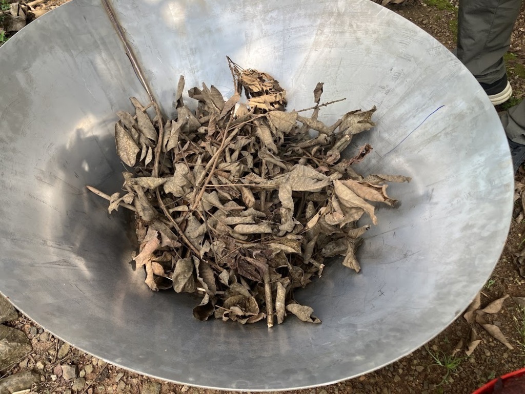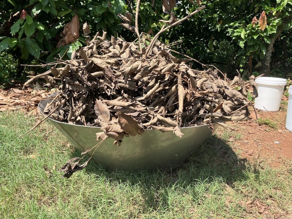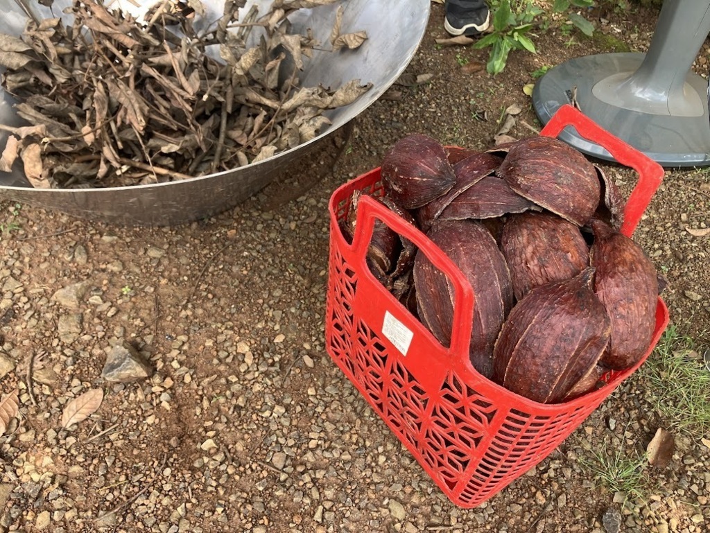 実施したのは雨季の時期で、カカオの収穫量は多くありませんでした。 そのため、十分な量のカカオポッドの殻(外果皮+中果皮)が揃わず、炭化器を満杯にすることはできませんでした。 乾燥させた殻に加えて、農園の木の枝や落ち葉を追加し、炭化器の上部まで届くように山盛りにしてから作業を始めました。