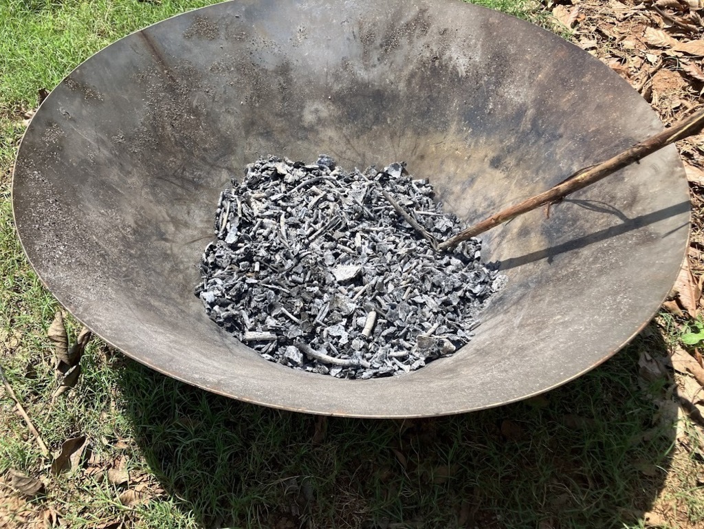 素材の量が少なかったこともあり、数十分で全体がしっかりと炭化。 続いて消火作業に移ります。 急激な温度変化が起きないよう、準備していた水を少量ずつ丁寧にかけて冷却させます。 火が完全に消えたことを確認し、そこからさらに1~2時間ほど自然冷却を行いました。