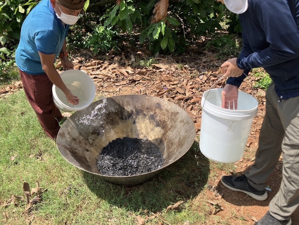 完成した炭は軽く、手に取るとさらっとしています。 このバイオチャーを、カカオの木の根の周りに均等に撒きました。 バイオ炭は土壌改良材としての効果が期待され、保水性・通気性の向上や、微生物の活動を支える働きがあります。 今後は、実際に土壌の変化や木の生育への影響を確認しながら、継続的に検証を進めていきます。
