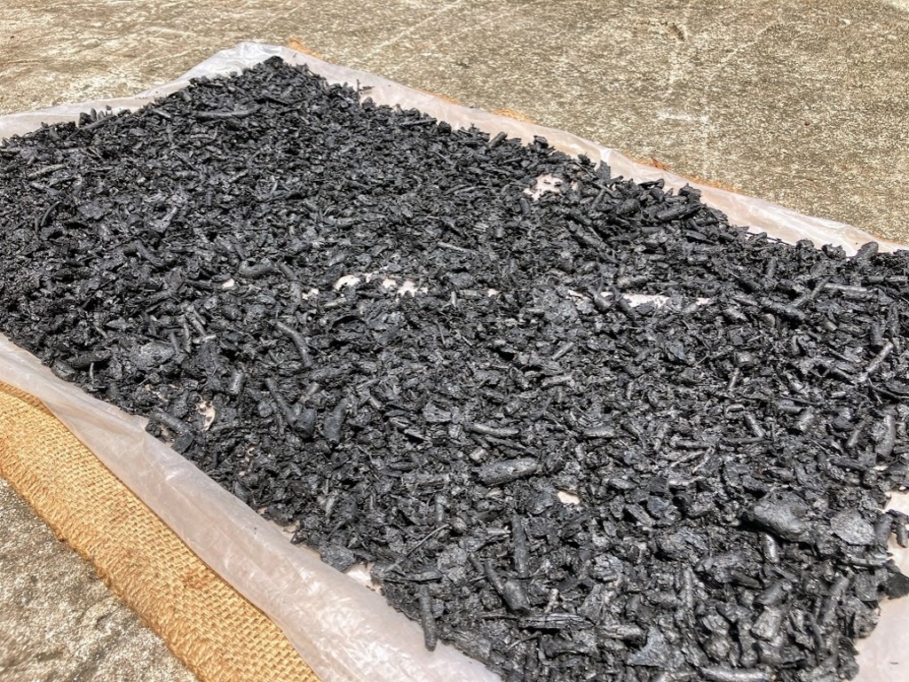 触れられる程度まで温度が下がったタイミングで炭を取り出し、農園の広場で天日干し。 天候にも恵まれ、数時間の乾燥で十分な仕上がりになりました。 こうして、OCAとして初めてのカカオポッドバイオチャーが完成しました。