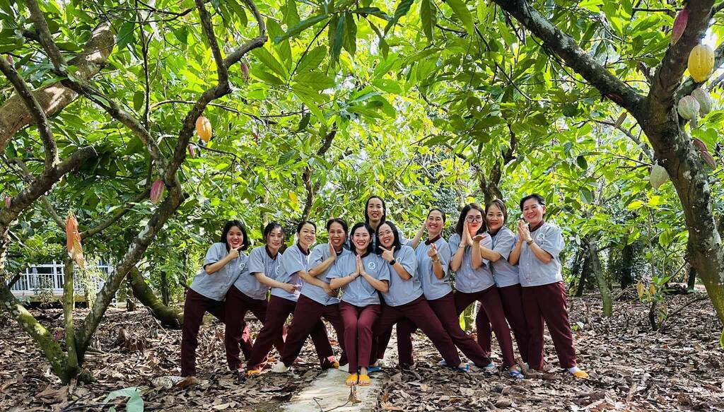 写真に写っているのは、ベトナム・ブンタウのカカオ農園で働く、OCAの女性スタッフたちです。 強い日差しの中でも、土に触れ、カカオの木と向き合いながら、日々の仕事を丁寧に積み重ねています。 OCAのものづくりは、こうした現場の手仕事と、人の力によって支えられています。