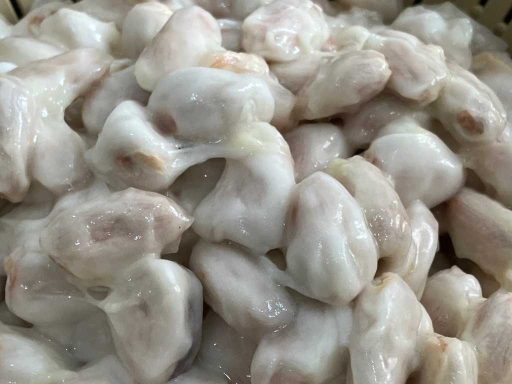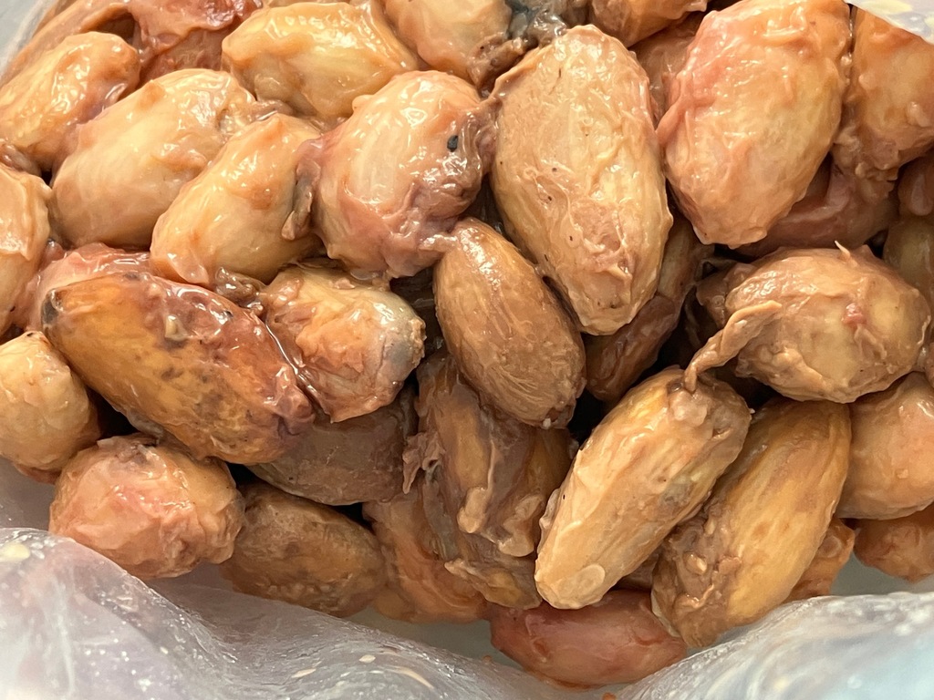 カカオポッドを割ると、中から白い果肉(カカオパルプ)に包まれたカカオ豆が現れます。 農園で発酵が進んだ豆と比べると、色の違いは一目瞭然です。すでに発酵が始まった豆は茶色へと変化し、果肉も溶け出しています。