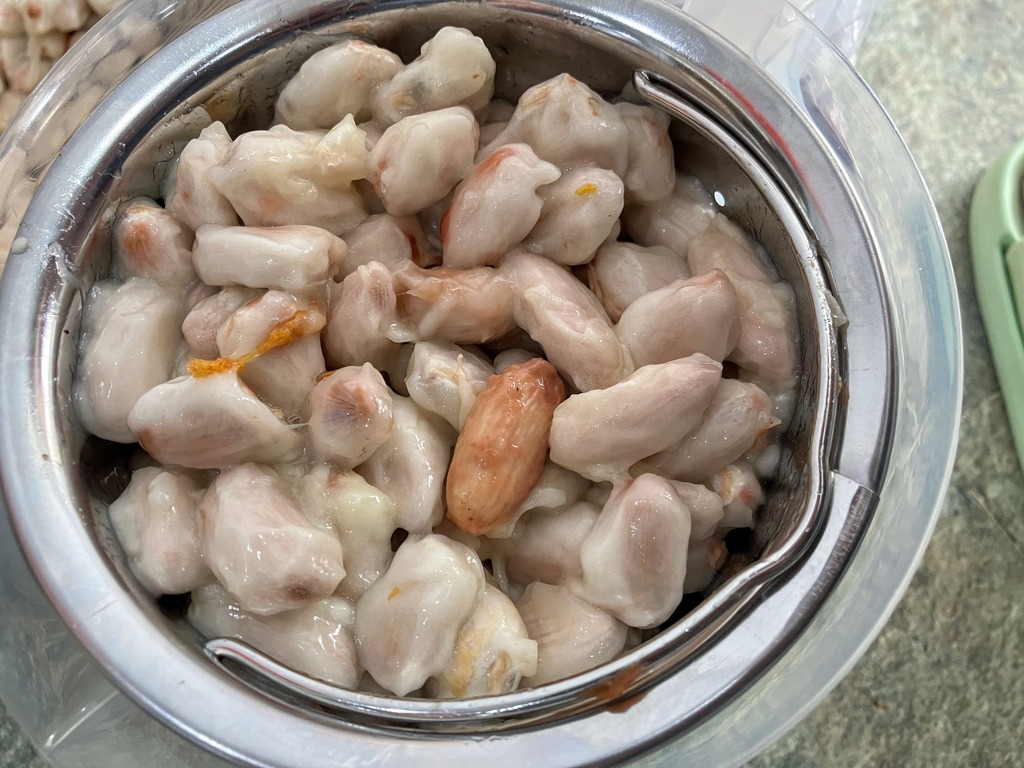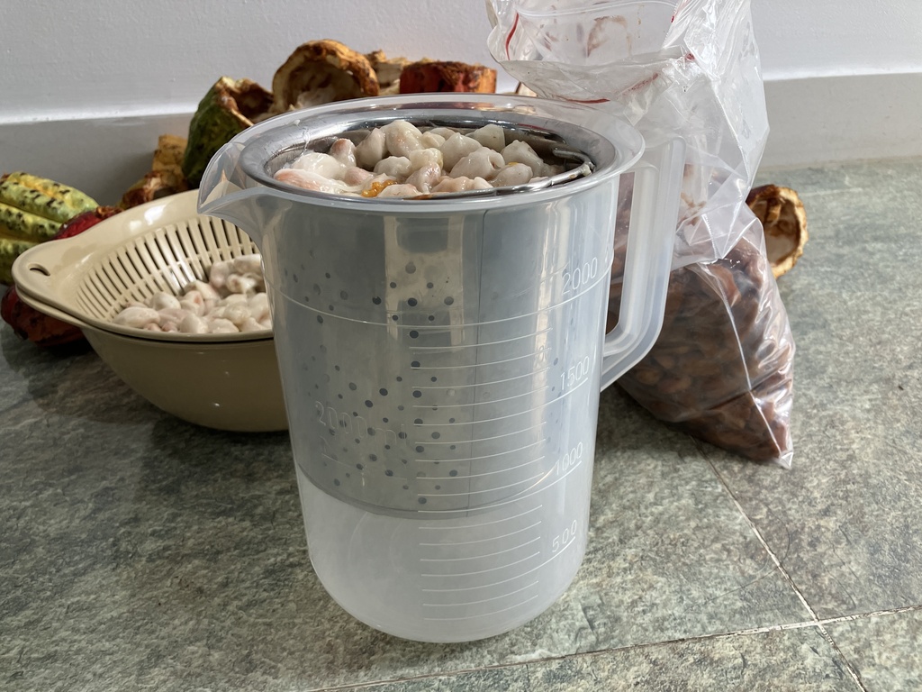 使用している器具は、市販の2L計量カップに、排水口用のステンレス器具がぴったり収まる構造です。 底に数センチの隙間を設けることで、発酵によって溶け出すカカオパルプの液体が下へと流れ、豆が浸かりすぎないようになっています。この構造が、少量発酵では非常に重要になります。