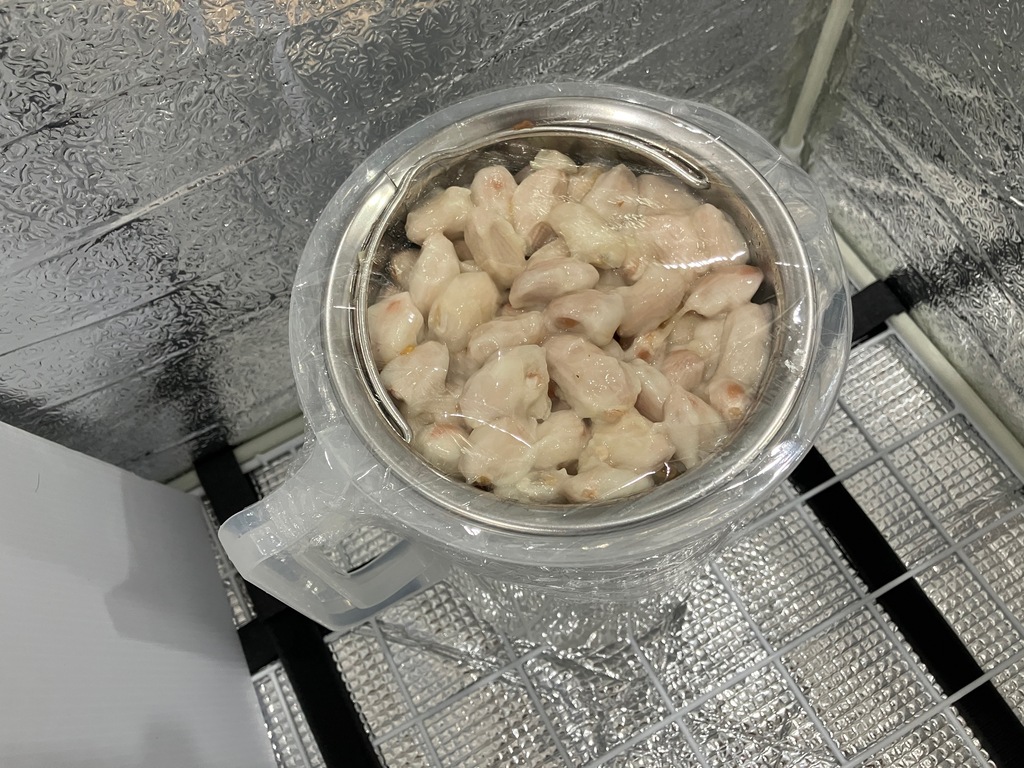 ラップで軽く覆った容器を保温器に入れ、一定温度を保ちながら発酵を進めていきます。 農園とは異なる環境だからこそ、細かな条件設定が重要になります。