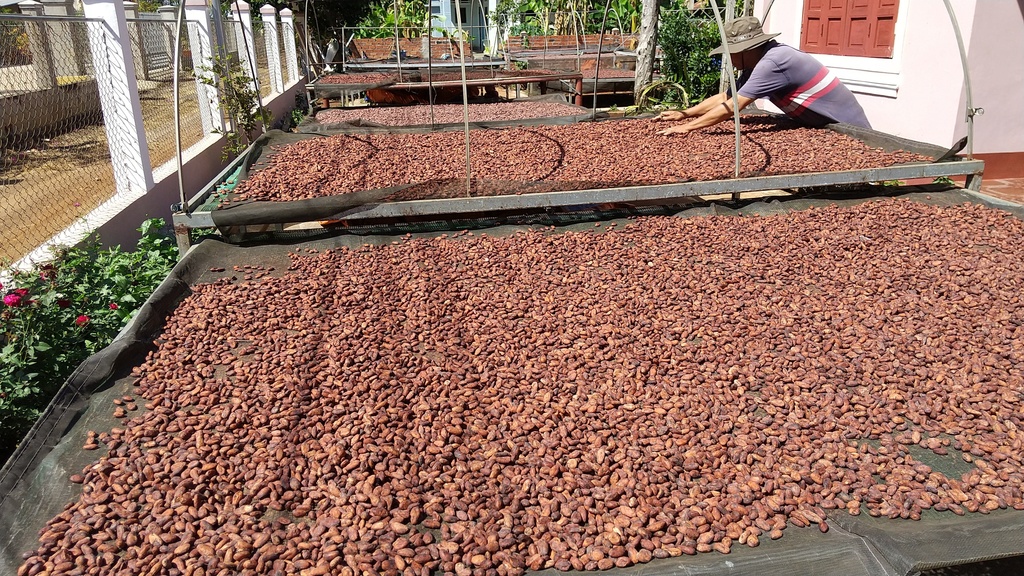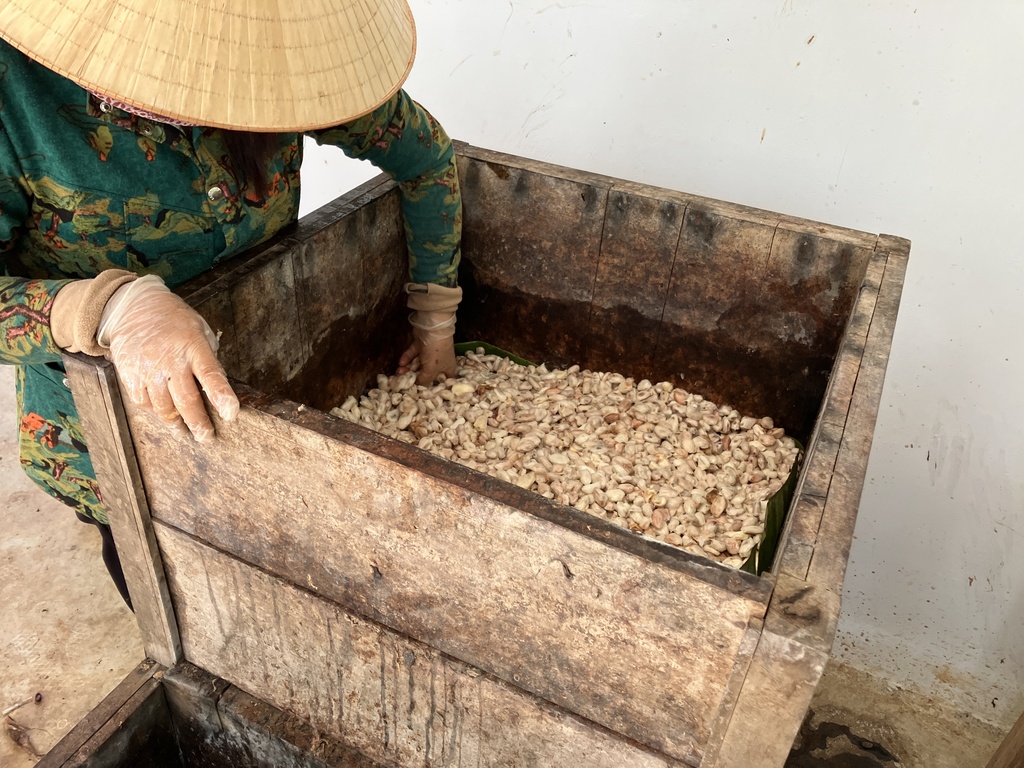収穫直後の生カカオ豆は、ポリフェノールが非常に多く、強い苦味と渋みを持っています。 発酵が始まると、微生物が果肉の糖を使い、熱や酸を生み出し、豆の内部に変化を起こします。 その結果、ポリフェノールの量は少しずつ減りますが、同時に味は丸くなり、香りの土台が形づくられていきます。