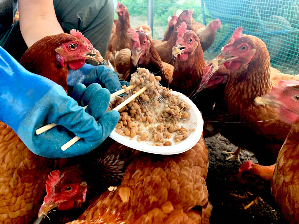 私たちの鶏たちには、日々の健康維持のために、オーガニックの黒酢、ニンニク、生姜、唐辛子などを与えています。